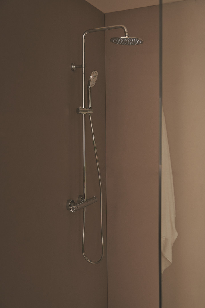 mit Metall-Kopfbrause mit Kugelgelenk, Ø 200 mm, 3-Funktionshandbrause Ø 100 mm mit Anti-Kalk-Funktion, wasserführende Brausestange mit schwenkbarem Druckknopfschieber und höhenverstellbarer Wandhalterung, Brauseschlauch Idealflex 1500 mm, Anschluss G 1/2, CeraTherm T50 Brausethermostat Aufputz, DN 15 mit Duschablage, Rückflussverhinderer, DVGW-eigensicher, S-Anschlüsse verdeckt mit konischen Metallrosetten (verstellbar von 137-163 mm), Ausladung 82 mm, Thermostatkartusche mit Wachsdehnstoffelement, Anti-Kalk-Funktion, Heißwassertemperatureinstellung mit Verbrühschutz, RV-Patrone auf der Warmwasserseite mit integriertem Überdruckventil, dient zur Druckentlastung (Schutz der Armatur) bei Drücken größer 16 bar, Wassermengenregulierung mit 2-Wege-Ventil und ECO-Spartaste und keramischen Dichtscheiben, Geräuschverhalten DIN 4109, Gruppe 1