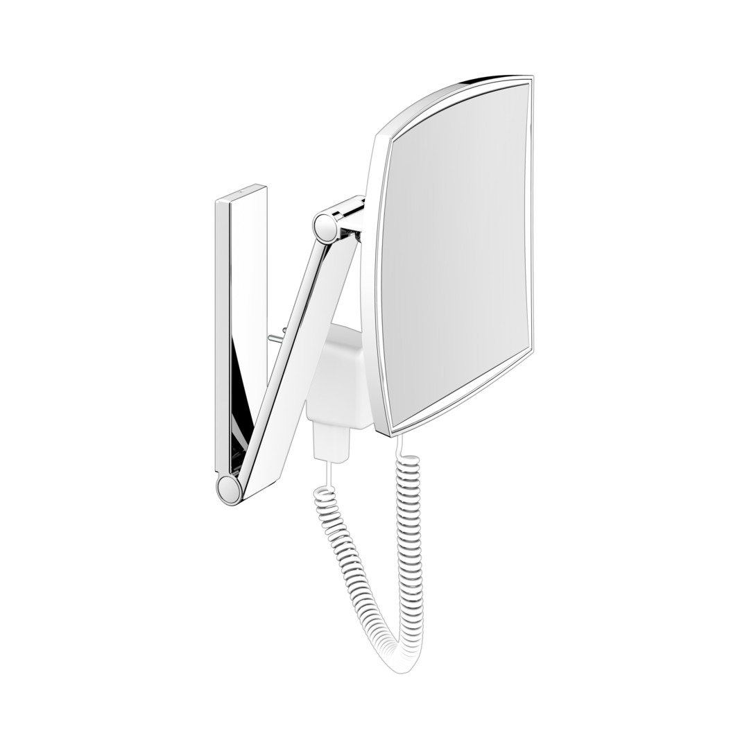 Wandmodell, eckig, 6500 Kelvin (Tageslicht), mit Spiralkabel (Blocklänge 400 mm) und Kabelschalter, an dreidimensional verstellbarem Schwenkarm, Spiegel einseitig, Vergrößerungsfaktor x 5, Bedienung über Kabelschalter, Stromversorgung: Netzanschluss über Steckernetzteil, 12 V Steckernetzteil, Eingangsbereich 220~240 V, Beleuchtung LED 7 Watt