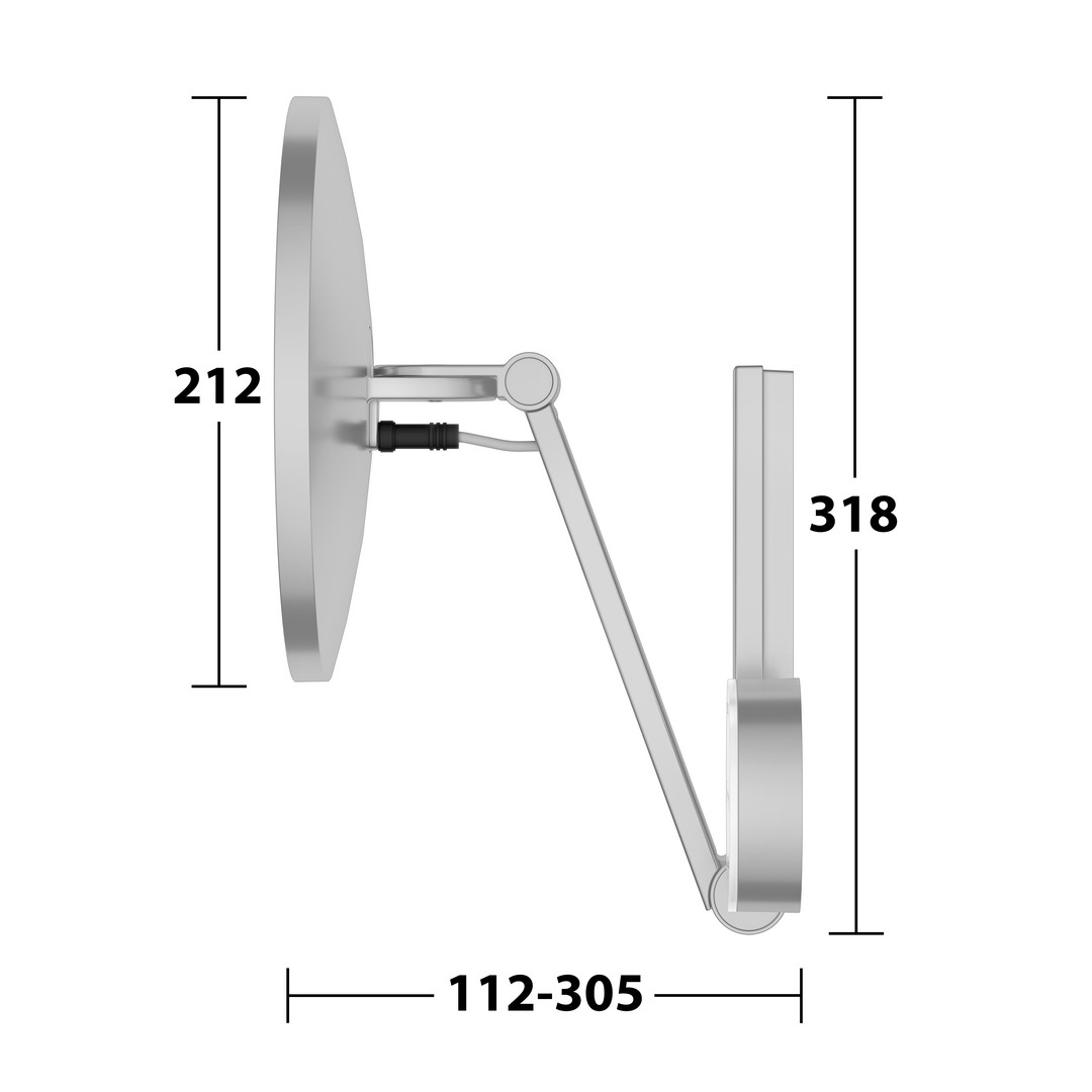 Wandmodell, eckig, IP24, stufenlos einstellbar von 2700 Kelvin (warmweiß) bis 6500 Kelvin (Tageslicht), mit UP-Kabelführung, an dreidimensional verstellbarem Schwenkarm, Spiegel einseitig, Vergrößerungsfaktor x 5, Bedienung über Glasbedienfeld mit kapazitiver Touch-Sensorik und LED-Anzeige, Stromversorgung: Netzanschluss über Wandanschlussdose, 12 V Unterputz-Netzteil, Eingangsbereich 220~240 V, Unterputz-Netzteil und Niedervolt-Verbindungskabel im Lieferumfang enthalten, Beleuchtung: LED 4,5 Watt