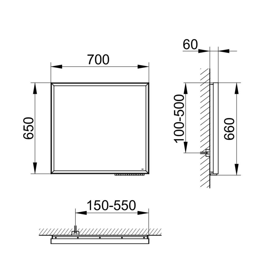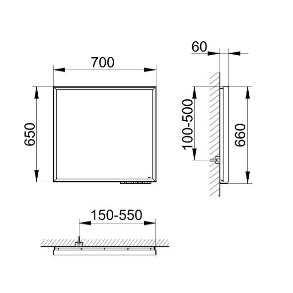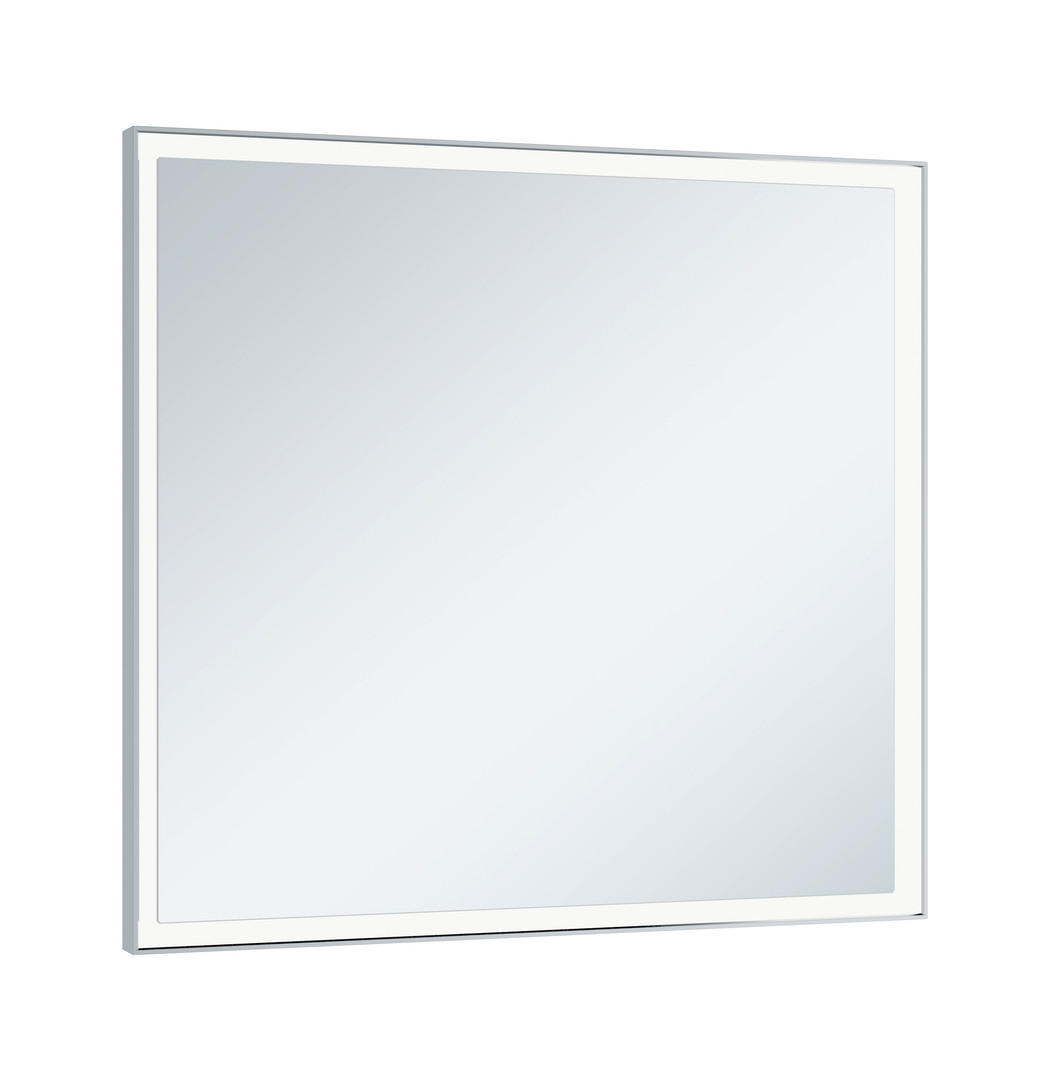 mit umlaufendem Aluminium-Rahmen, Bedienfeld mit kapazitiver Touch-Sensorik, Funktionen: ein-/ausschalten, stufenlos dimmen, Einstellen der Lichtfarbe, integrierte Nebenstellenfunktion (Raumschalter), Lichtfarbe: stufenlos einstellbar von 2700 (warmweiß) bis 6500 Kelvin (Tageslicht), Rahmen- und Waschtischbeleuchtung separat schalt- und dimmbar, LED, Spiegelheizung mittig platziert, optische Anzeige der Aufheizphase, automatische Abschaltung nach 20 Minuten