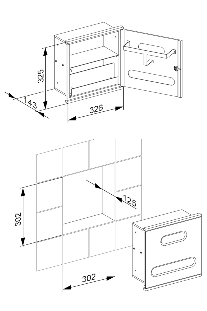 Wandmontage Unterputz, Papiertuchspender, für gefalzte Papiertücher (z-Faltung) geeignet (250 x 230 mm), Aufnahme für Kleenexbox, Betätigung von vorne, Befüllung durch abschließbare Fronttür, Einbaukorpus aus verzinktem Stahlblech, Einbautiefe 125 mm, verdeckte Befestigung, mit Befestigungs-Set