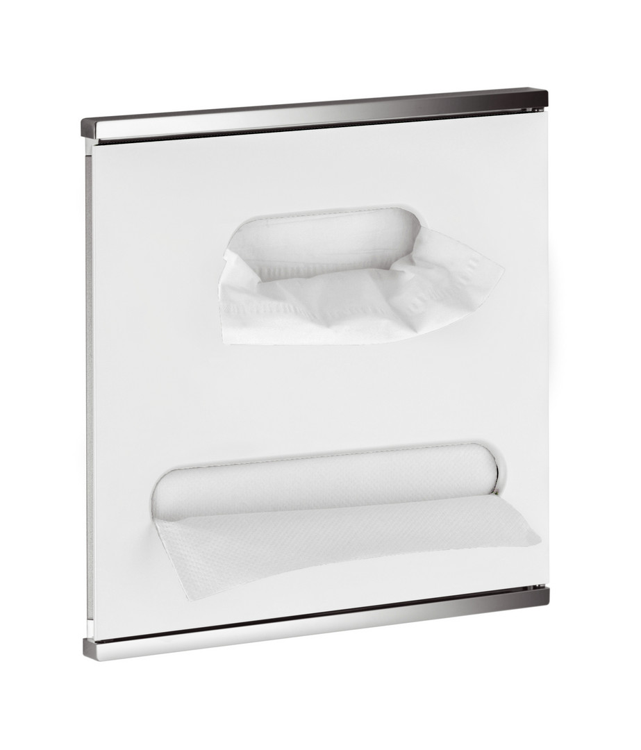 Wandmontage Unterputz, Papiertuchspender, für gefalzte Papiertücher (z-Faltung) geeignet (250 x 230 mm), Aufnahme für Kleenexbox, Betätigung von vorne, Befüllung durch abschließbare Fronttür, Einbaukorpus aus verzinktem Stahlblech, Einbautiefe 125 mm, verdeckte Befestigung, mit Befestigungs-Set