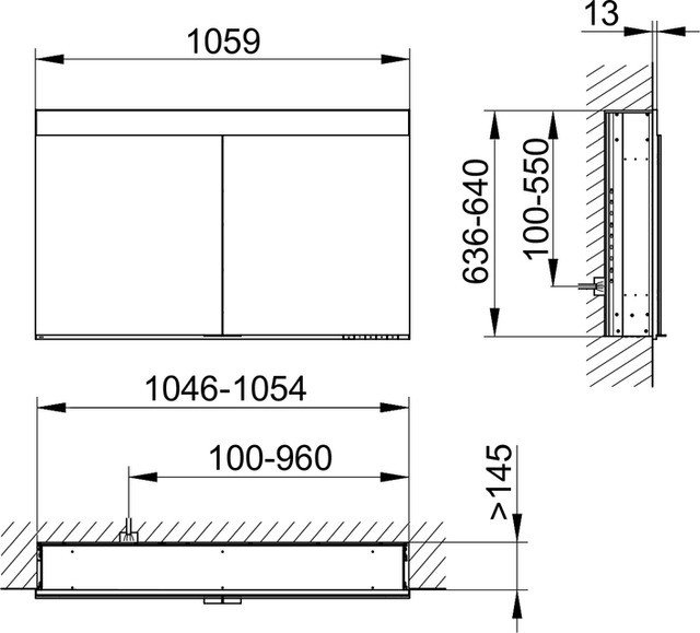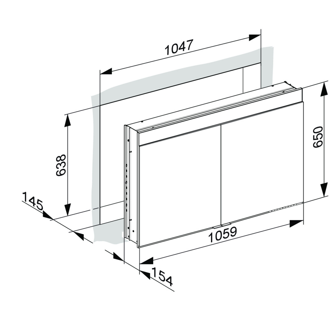 Tiefe vor der Wand 24 mm, Drehtüren aus Kristall-Doppelspiegeln mit Anschlagsdämpfung, Korpus: Aluminium (silber-gebeizt-eloxiert), Rückwand: verspiegelt, Schutzart: IP24, Bedienung: Bedienfeld mit kapazitiver Touch-Sensorik, Funktionen: ein-/ausschalten, stufenlos dimmen, integrierte Nebenstellenfunktion (Raumschalter), Beleuchtung: stufenlos einstellbar von 2700 Kelvin (warmweiß) bis 6500 Kelvin (Tageslicht), LED, Innenraumausleuchtung, Spiegelheizung optional (mittig der Türen platziert, optische Anzeige der Aufheizphase, automatische Abschaltung nach 20 Minuten, 56 Watt), Ausstattung: 2x innenliegende Steckdose, 3x höhenverstellbare Glasablage (710 mm Breite), 2 x 3 höhenverstellbare Glasablagen (1060 mm Breite), 1x Aufbewahrungsfach mit verschiebbarem Glasdeckel (710 mm Breite), 2x Aufbewahrungsfach mit verschiebbarem Glasdeckel (1060 mm Breite), Innenraumausleuchtung