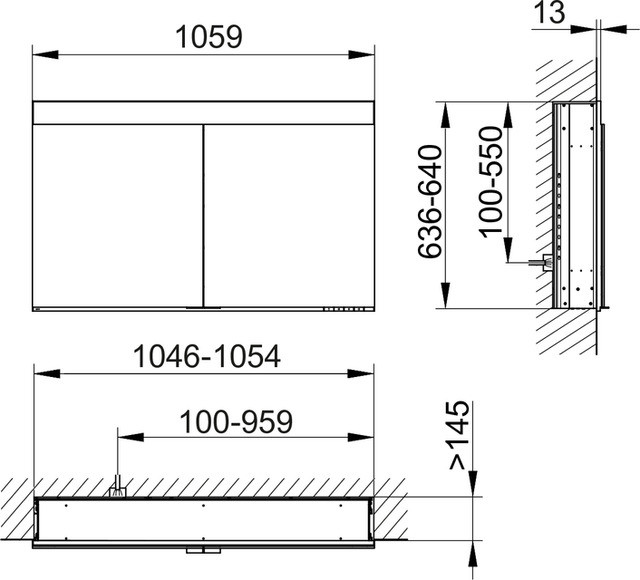 Tiefe vor der Wand 24 mm, Drehtüren aus Kristall-Doppelspiegeln mit Anschlagsdämpfung, Korpus: Aluminium (silber-gebeizt-eloxiert), Rückwand: verspiegelt, Schutzart: IP24, Bedienung: Bedienfeld mit kapazitiver Touch-Sensorik, Funktionen: ein-/ausschalten, stufenlos dimmen, integrierte Nebenstellenfunktion (Raumschalter), Beleuchtung: stufenlos einstellbar von 2700 Kelvin (warmweiß) bis 6500 Kelvin (Tageslicht), LED, Innenraumausleuchtung, Spiegelheizung optional (mittig der Türen platziert, optische Anzeige der Aufheizphase, automatische Abschaltung nach 20 Minuten, 56 Watt), Ausstattung: 2x innenliegende Steckdose, 3x höhenverstellbare Glasablage (710 mm Breite), 2 x 3 höhenverstellbare Glasablagen (1060 mm Breite), 1x Aufbewahrungsfach mit verschiebbarem Glasdeckel (710 mm Breite), 2x Aufbewahrungsfach mit verschiebbarem Glasdeckel (1060 mm Breite), Innenraumausleuchtung