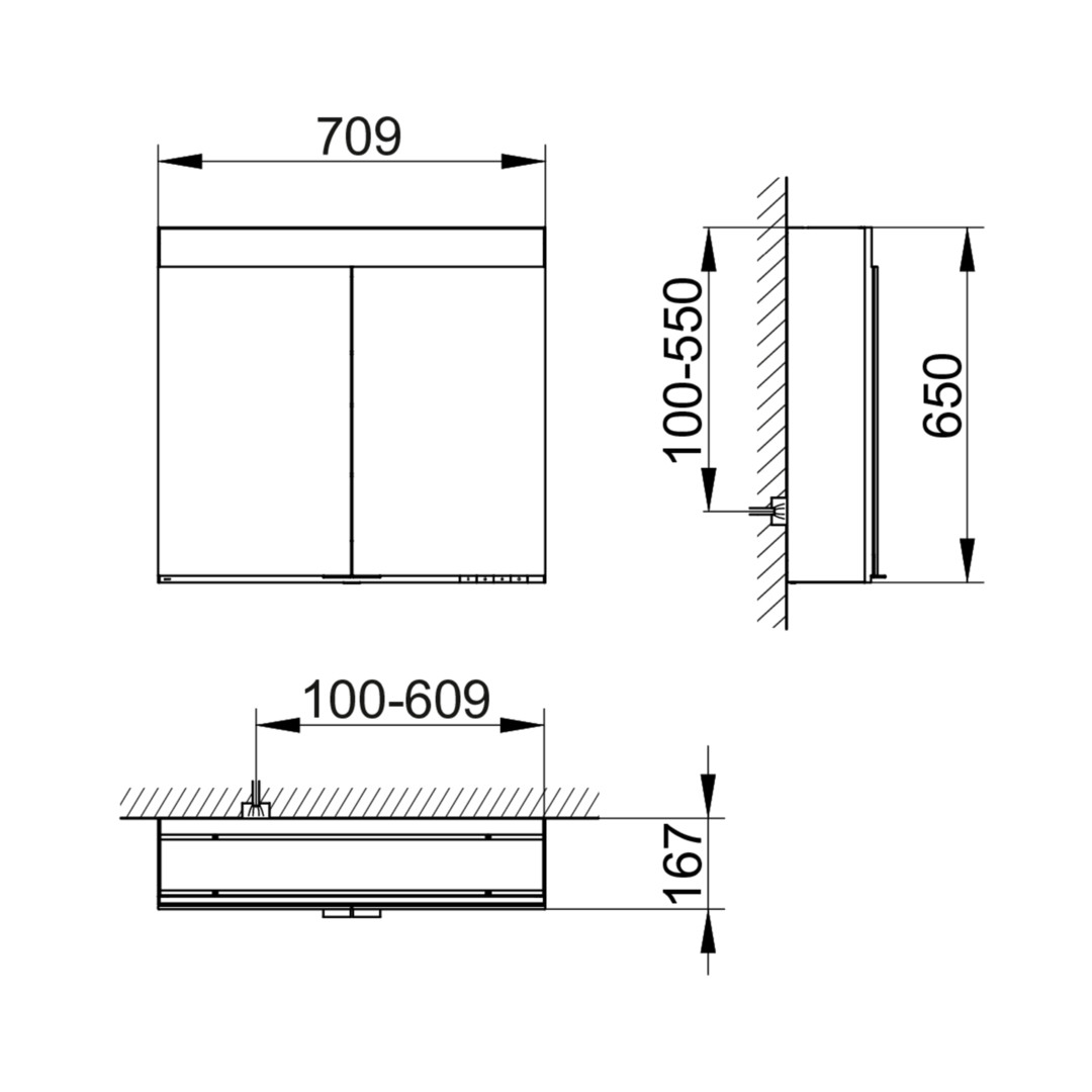 Schutzart IP 24, Drehtüren aus Kristall-Doppelspiegel mit Anschlagsdämpfung, Korpus Aluminium silber-eloxiert, Korpusseite Glas weiß lackiert, Korpusrückwand Spiegel, Bedienfeld mit kapazitiver Touch-Sensorik, Funktion ein-/ausschalten, stufenlos dimmbar, Einstellen der Lichtfarbe, integrierte Nebenstellenfunktion (Raumschalter), Beleuchtung 2700 Kelvin (warmweiß) bis 6500 Kelvin (tageslichtweiß), horizontal, Innenraumausleuchtung, LED, 2 innenliegende Steckdosen, 3 höhenverstellbare Glasablagen, Aufbewahrungsfach mit verschiebbarem Glasdeckel