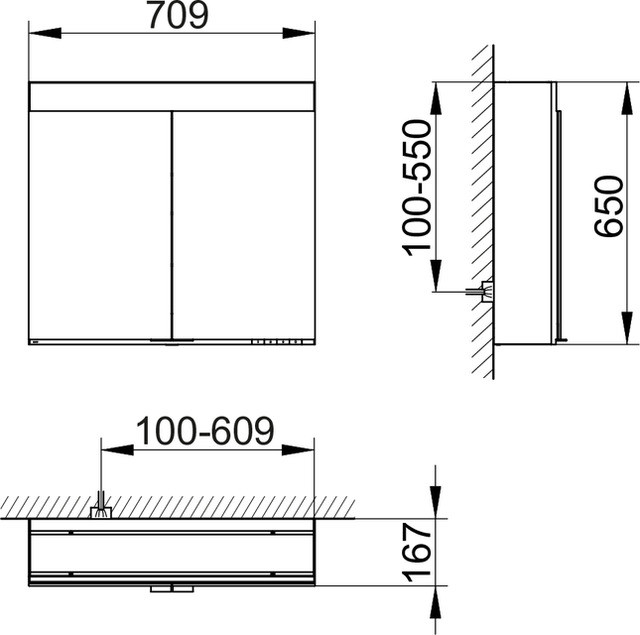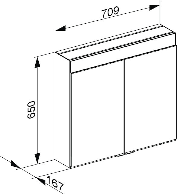 Schutzart IP 24, Drehtüren aus Kristall-Doppelspiegel mit Anschlagsdämpfung, Korpus Aluminium silber-eloxiert, Korpusseite Glas weiß lackiert, Korpusrückwand Spiegel, Bedienfeld mit kapazitiver Touch-Sensorik, Funktion ein-/ausschalten, stufenlos dimmbar, Einstellen der Lichtfarbe, integrierte Nebenstellenfunktion (Raumschalter), Beleuchtung 2700 Kelvin (warmweiß) bis 6500 Kelvin (tageslichtweiß), horizontal, Innenraumausleuchtung, LED, 2 innenliegende Steckdosen, 3 höhenverstellbare Glasablagen, Aufbewahrungsfach mit verschiebbarem Glasdeckel