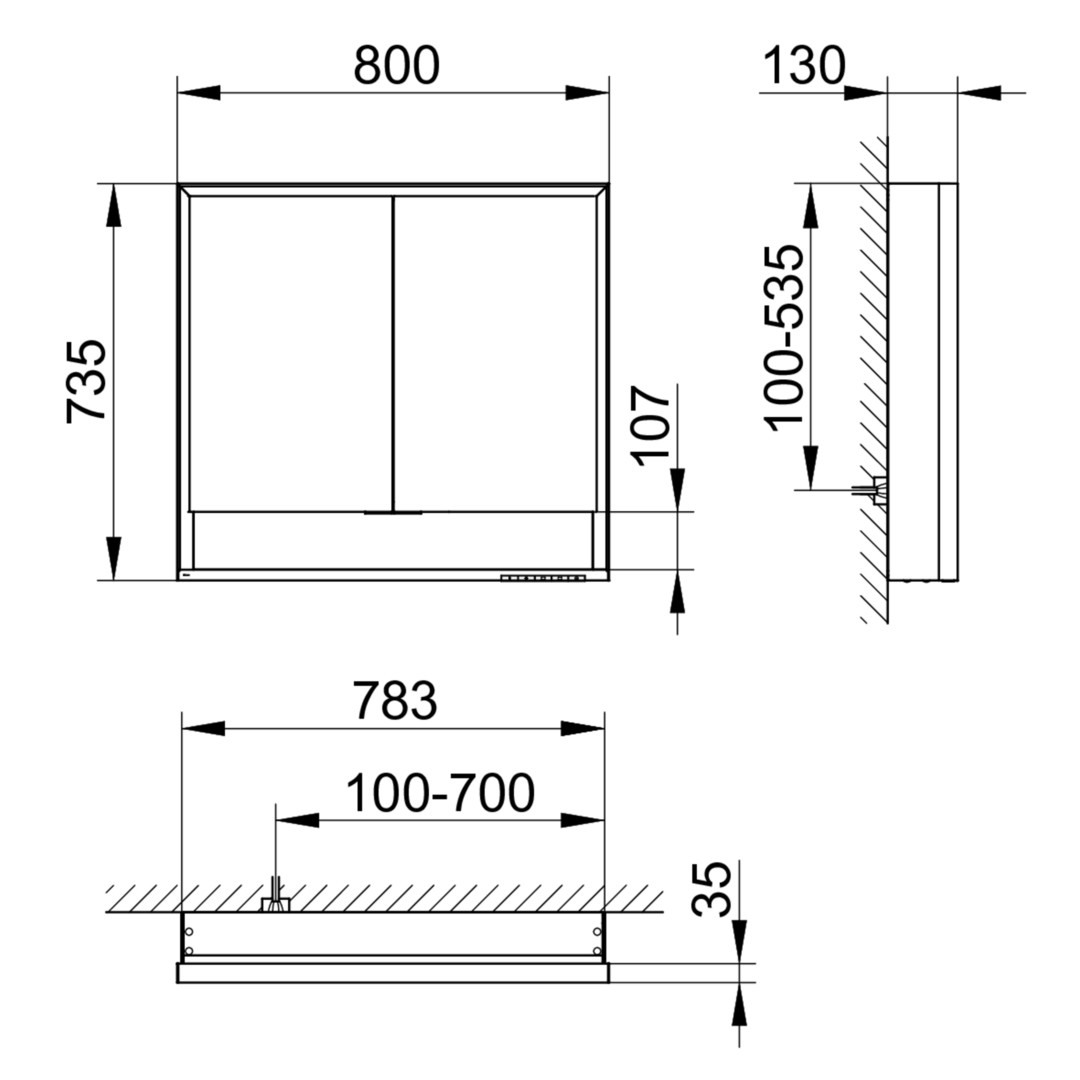 Drehtüren aus Kristall-Doppelspiegel mit Anschlagsdämpfung, Korpus Aluminium silber-eloxiert, Korpusseite Spiegel, Korpusrückwand Spiegel, Bedienfeld mit kapazitiver Touch-Sensorik, Funktion Ein-/ausschalten, stufenlos dimmbar, Einstellen der Lichtfarbe, integrierte Nebenstellenfunktion (Raumschalter), Beleuchtung 2700 Kelvin (warmweiß) bis 6500 Kelvin (tageslichtweiß), vertikal und horizontal (nur oben), Waschtisch- / Fachbeleuchtung, Innenraumausleuchtung, LED, 2 innenliegende Steckdosen, 2 x 2 höhenverstellbare Glasablagen, offenes Ablagefach über die ganze Breite, Spiegelheizung mittig des Spiegels platziert, optische Anzeige der Aufheizphase, automatische Abschaltung nach 20 Minuten, 60 W, Schutzart IP 24