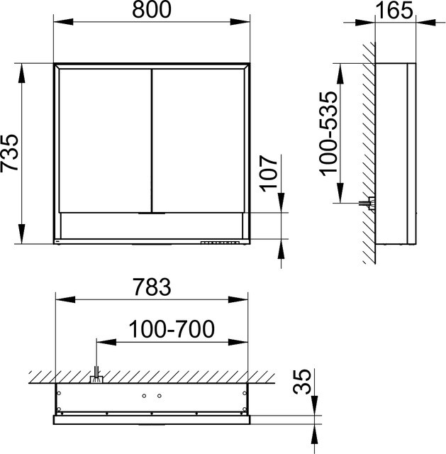 Drehtüren aus Kristall-Doppelspiegel mit Anschlagsdämpfung, Korpus Aluminium silber-eloxiert, Korpusseite Spiegel, Korpusrückwand Spiegel, Bedienfeld mit kapazitiver Touch-Sensorik, Funktion Ein-/ausschalten, stufenlos dimmbar, Einstellen der Lichtfarbe, integrierte Nebenstellenfunktion (Raumschalter), Beleuchtung 2700 Kelvin (warmweiß) bis 6500 Kelvin (tageslichtweiß), vertikal und horizontal (nur oben), Waschtisch- / Fachbeleuchtung, Innenraumausleuchtung, LED, 2 innenliegende Steckdosen, 2 x 2 höhenverstellbare Glasablagen, offenes Ablagefach über die ganze Breite, Spiegelheizung mittig des Spiegels platziert, optische Anzeige der Aufheizphase, automatische Abschaltung nach 20 Minuten, 60 W, Schutzart IP 24