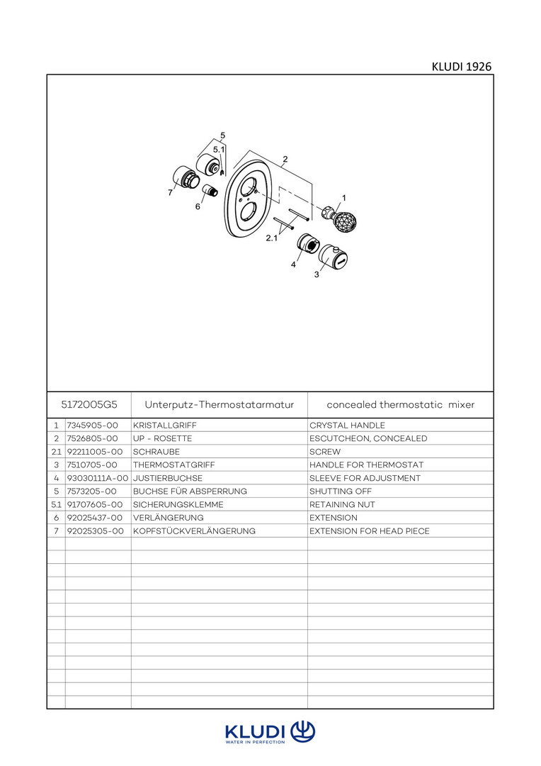 KLUDI 1926 Fertigmontageset Unterputz-Thermostat, Kristallgriff, mit Absperrventil, chrom W324746