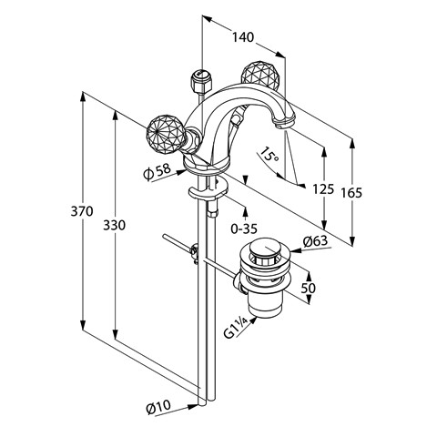 DN 15, Kreuzgriffe "Made with Swarovski", Einlochmontage, Durchflussmenge 13,5 l/min bei 3 bar, Cascade-Luftsprudler M 24 x 1, Keramik-Oberteil 180°, Ablaufgarnitur G 1 1/4, Kupferrohre 10 mm