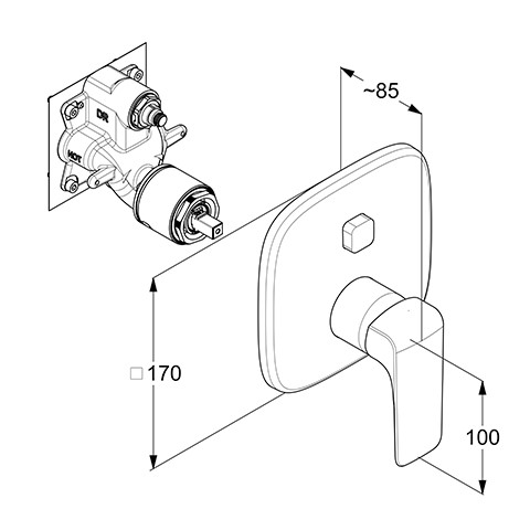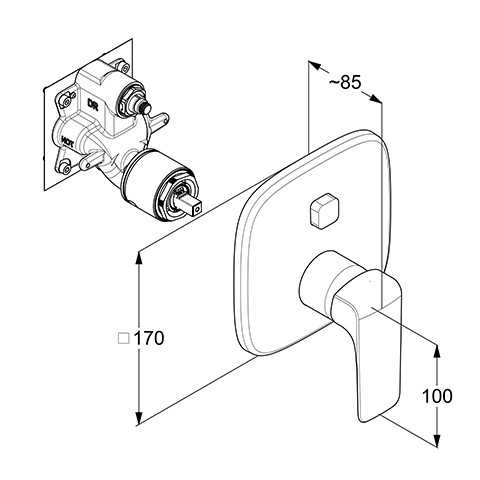 Feinbau-Set mit Funktionseinheit, geschlossener Hebel, Wandmontage, Keramik-Kartusche mit Heißwasserbegrenzung, Durchflussmenge 29 l/min bei 3 bar, automatische Umstellung Brause/Wanne, mit Druckumstellung PUSH & SWITSCH