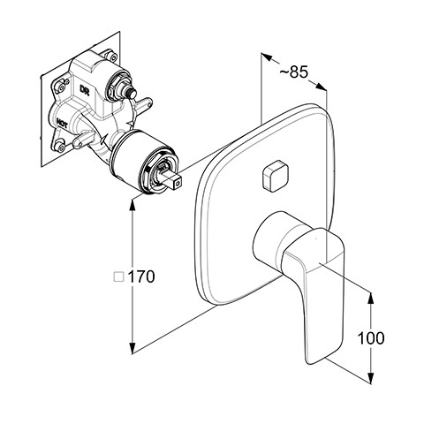 Feinbau-Set mit Funktionseinheit, geschlossener Hebel, Wandmontage, automatische Umstellung Brause/Wanne, mit Druckumstellung PUSH & SWITCH, Keramik-Kartusche mit Heißwasserbegrenzung, Durchflussmenge 25 l/min bei 3 bar, eigensicher gegen Rückfließen nach DIN EN 1717