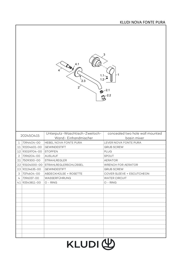 KLUDI Nova Fonte Pura Fertigmontageset UP-Waschtisch-Zweiloch-Wand-Einhebelmischer, Ausladung 220mm, chrom W324509