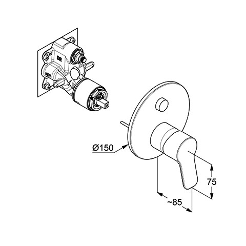 für 2 Verbraucher, Feinbau-Set mit Funktionseinheit, geschlossener Hebel, Keramik-Kartusche mit Heißwasserbegrenzung, Durchflussmenge Wanne 25 l/min bei 3 bar, Durchflussmenge 23 l/min bei 3 bar, automatische Umstellung Brause/Wanne, mit Druckumstellung PUSH & SWITCH, nach DIN EN 1717