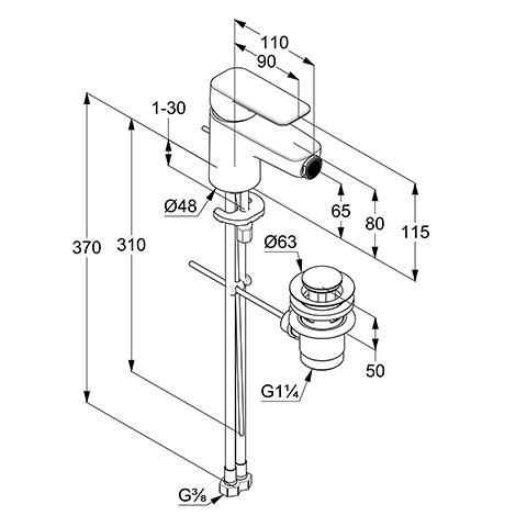 DN 15, geschlossener Hebel, Keramik-Kartusche mit Heißwasserbegrenzung, PCA s-pointer Luftsprudler M 24 x 1, Durchflussmenge 6 l/min bei 3 bar, Ablaufgarnitur G 1 1/4 aus Metall, flexible Anschlüsse G 3/8, Schnell-Montagesystem, Auslaufhöhe Unterkante 65 mm