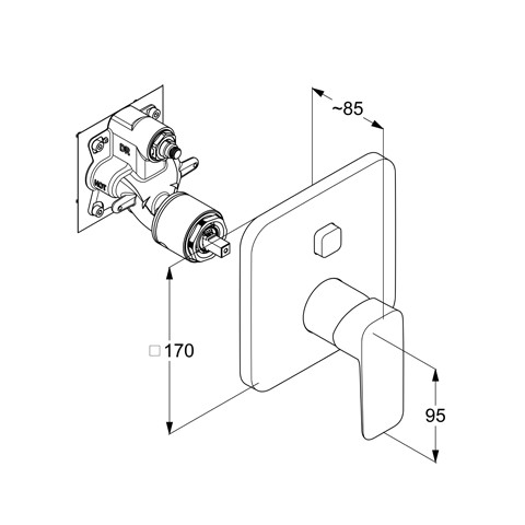 Feinbau-Set mit Funktionseinheit, geschlossener Hebel, Wandmontage, Keramik-Kartusche mit Heißwasserbegrenzung, Durchflussmenge 29 l/min bei 3 bar, automatische Umstellung Brause/Wanne, mit Druckumstellung PUSH & SWITCH