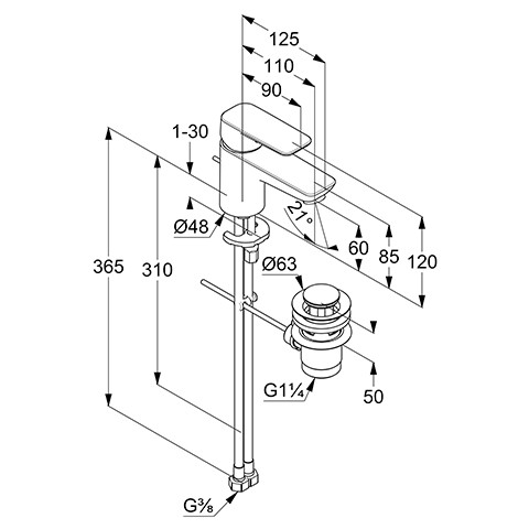 DN 15, geschlossener Hebel, Keramik-Kartusche mit Heißwasserbegrenzung, Strahlregler M 24 x 1, Durchflussmenge 7 l/min bei 3 bar, Ablaufgarnitur G 1 1/4 aus Metall, flexible Anschlüsse G 3/8, Schnell-Montagesystem, Auslaufhöhe Unterkante 60 mm