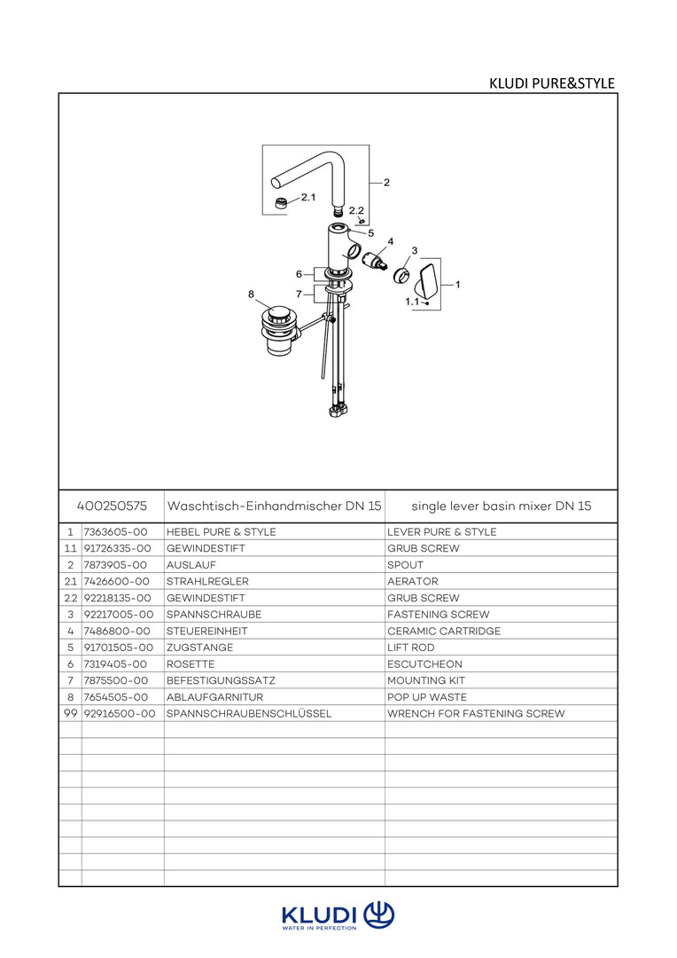 KLUDI PURE&STYLE Waschtisch-Einhebelmischer Hebel seitlich, mit Metall-Ablaufgarnitur, schwenkbarer Auslauf, chrom
