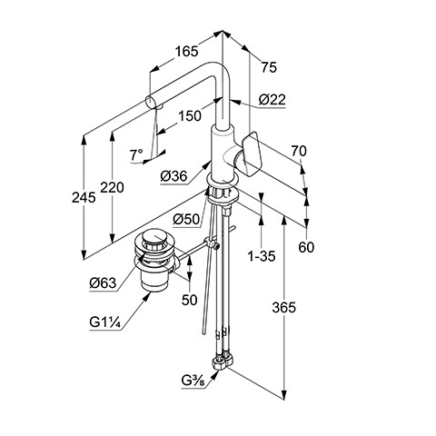 DN 15, geschlossener Hebel, Keramik-Kartusche, PCA Strahlregler M 16,5 x 1, Durchflussmenge 5 l/min bei 3 bar, Ablaufgarnitur G 1 1/4 aus Metall, flexible Anschlüsse G 3/8, Schnell-Montagesystem, Auslaufhöhe Unterkante 220 mm