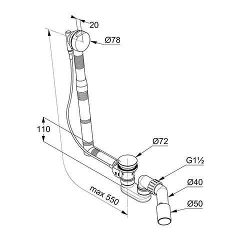 mit Bowdenzug für Bade- und tiefe Duschwannen, festem Geruchsverschluss, 2 Drehgelenke, 50 mm Wasserverschlusshöhe, mit Feinbau-Set, Anschlussstutzen DN 40/50, Exzentergarnitur