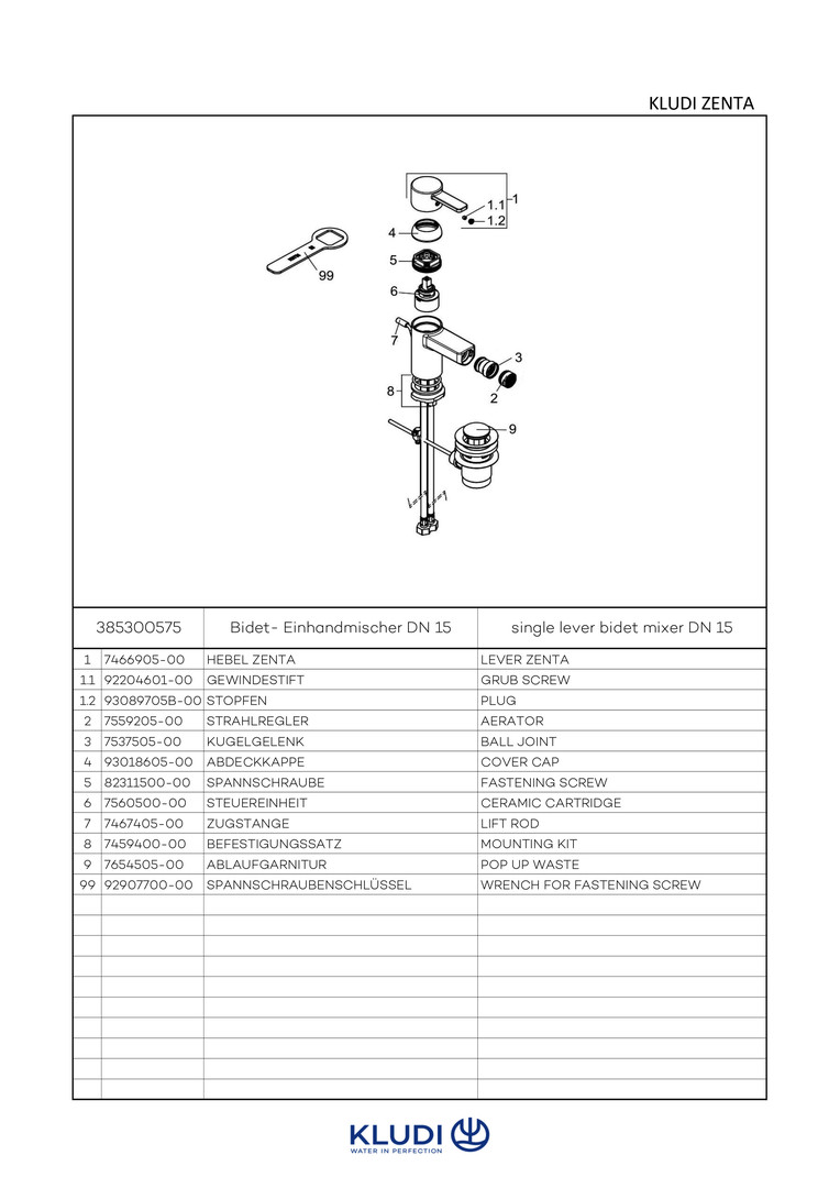 KLUDI ZENTA Bidet-Einhebelmischer mit Ablaufgarnitur, chrom