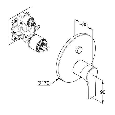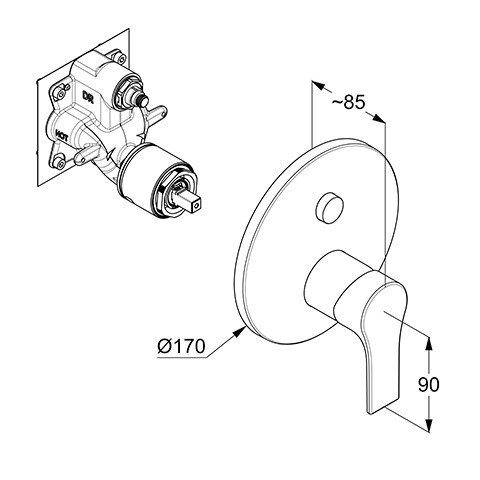 Feinbau-Set mit Funktionseinheit, geschlossener Hebel, Wandmontage, Keramik-Kartusche mit Heißwasserbegrenzung, Durchflussmenge 25 l/min bei 3 bar, automatische Umstellung Brause/Wanne, mit Druckumstellung PUSH & SWITCH, nach DIN EN 1717