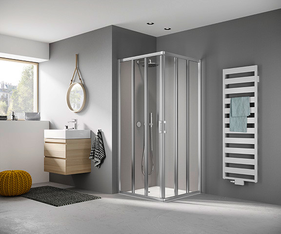 Kermi Wake Up Eckeinstiegshälfte Gleittür 3-tlg. silber/hochglanz, 75 x 200 cm, links, ESG klar Clean