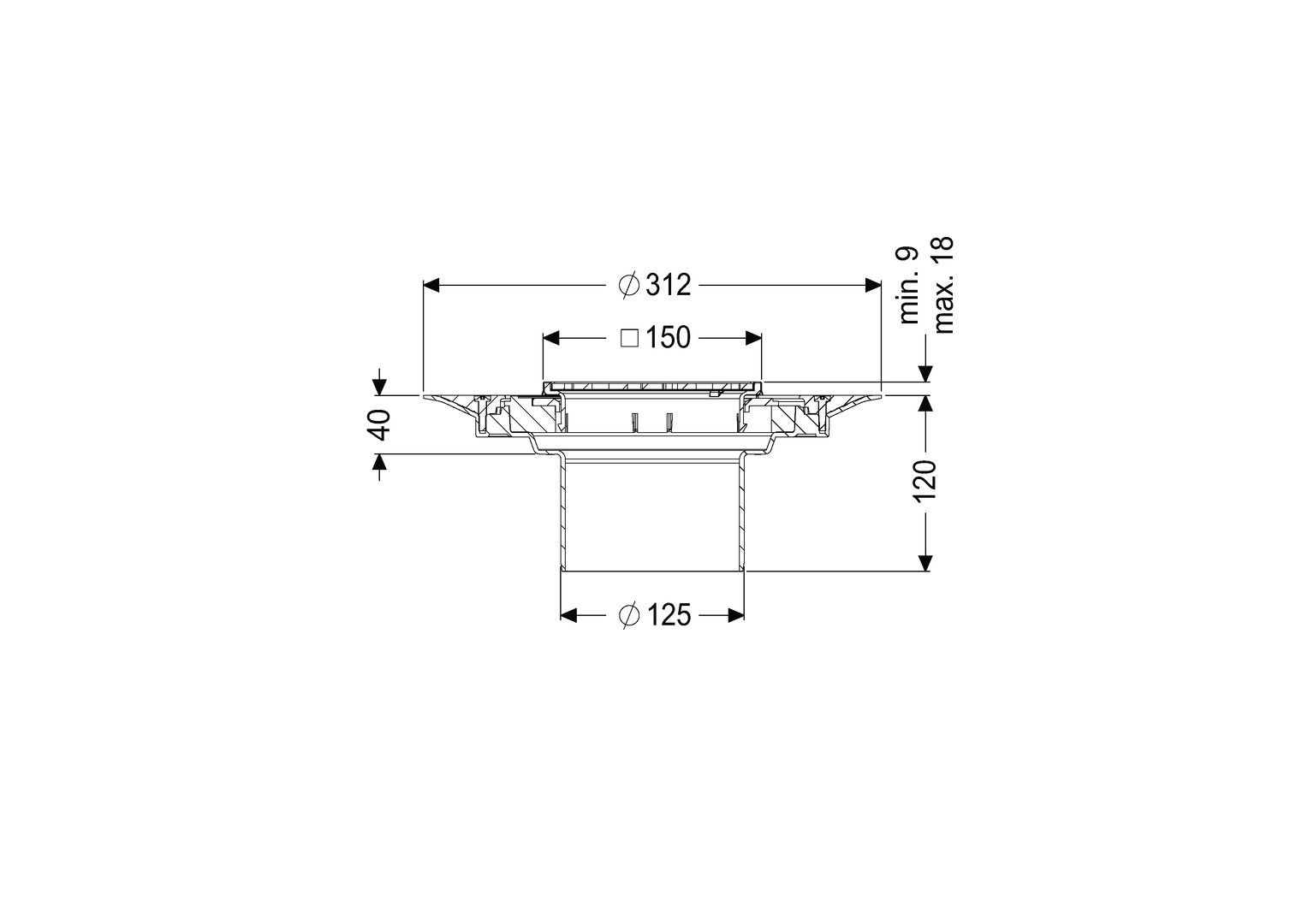 aus ABS, Rahmen aus Edelstahl, Klasse K 3, Belaghöhe 9-18 mm, mit Dichtmanschette, Abdeckung 150 x 150 mm, rutschhemmend