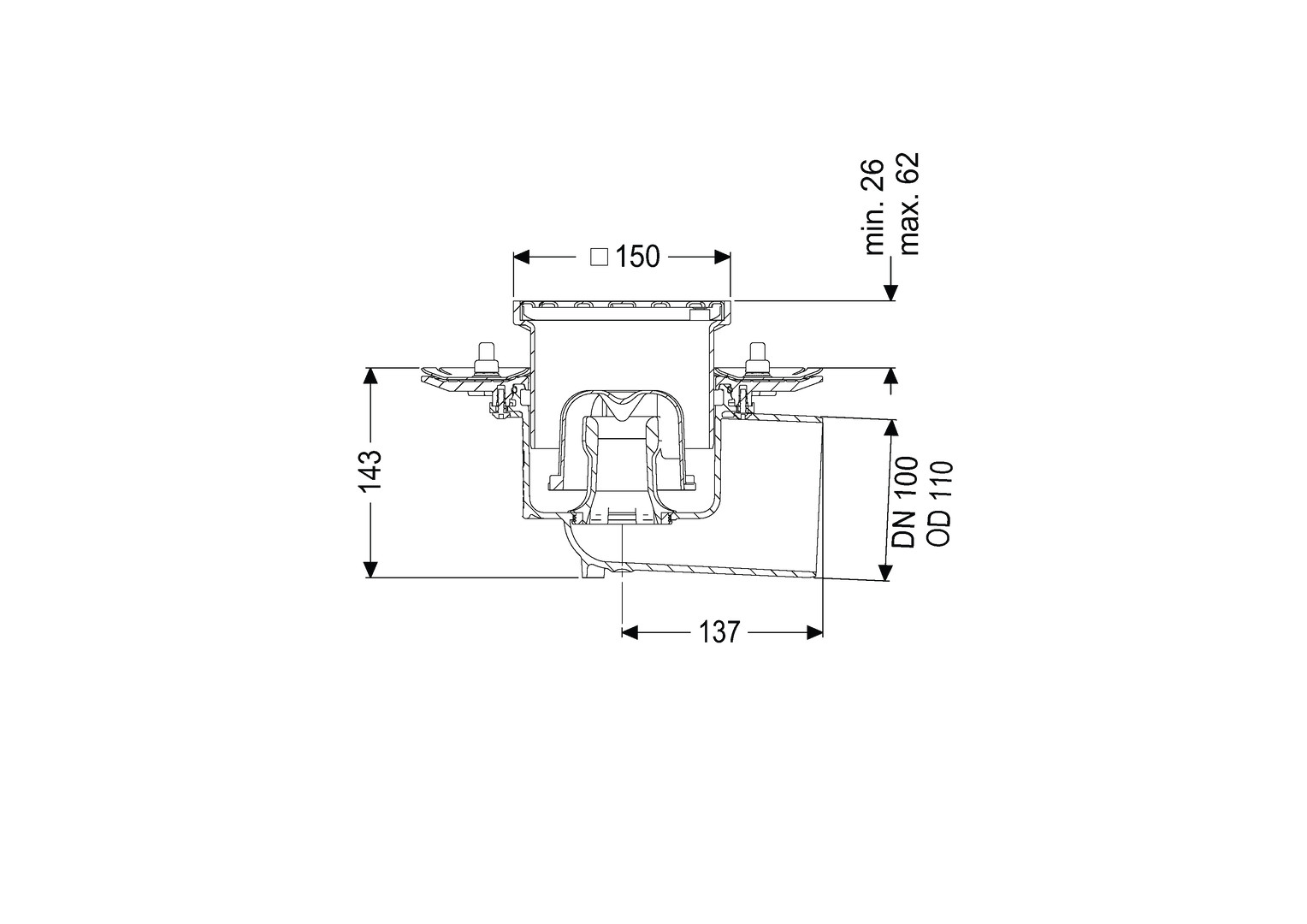 bestehend aus Grundkörper mit Auslauf seitlich, aus Ecoguss resistant, mit Pressdichtungsflansch, Geruchsverschluss, Auslaufstutzen für SML-Rohranschluss, Sperrwasserhöhe 50 mm, Aufsatzstück aus ABS, Schlitzrost 138 x 138 mm, aus Edelstahl V2A, Klasse K 3, verschraubt