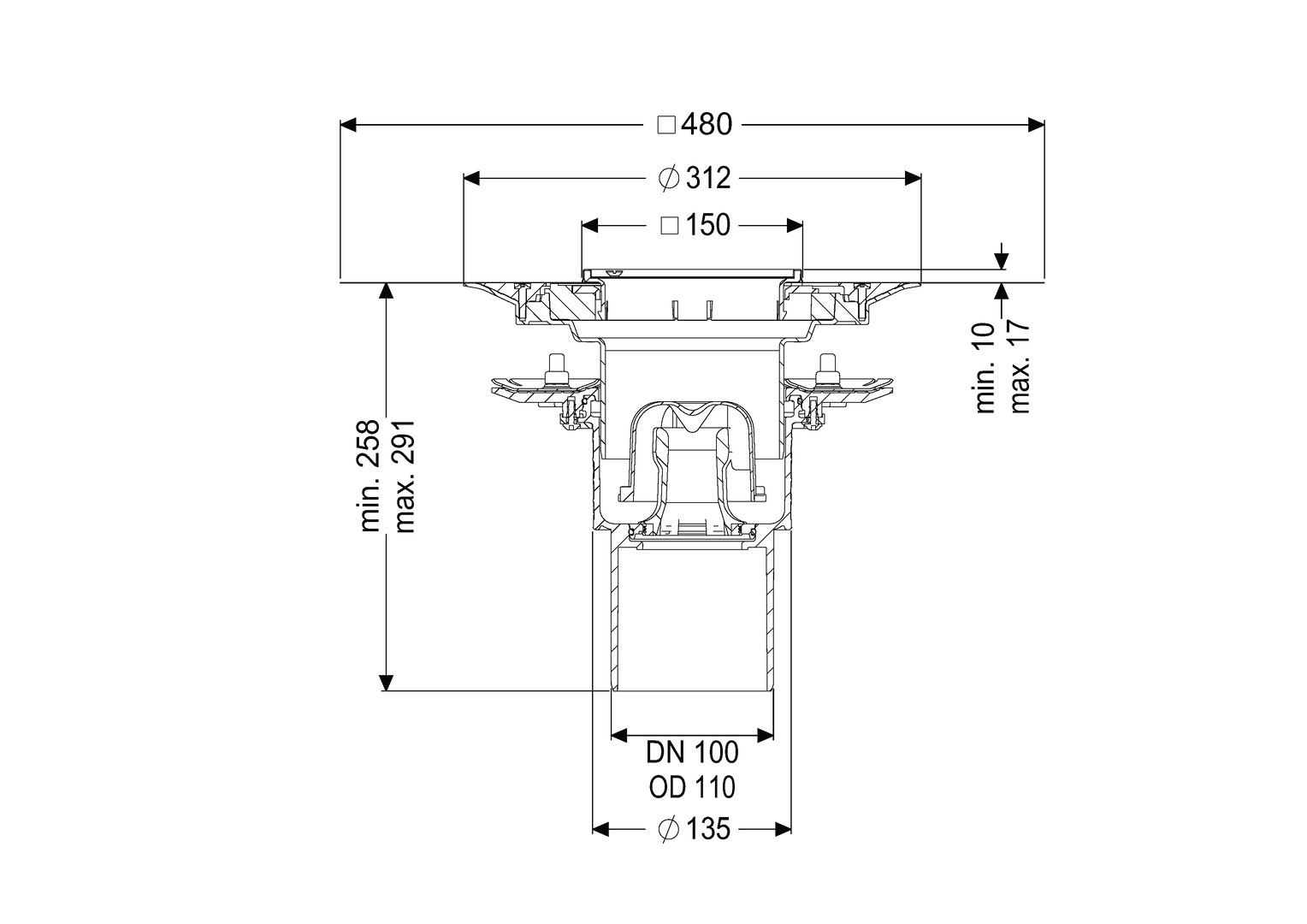 bestehend aus Grundkörper mit Auslauf senkrecht, aus Ecoguss resistant, mit Pressdichtungsflansch, Geruchsverschluss, Auslaufstutzen für SML-Rohranschluss, Sperrwasserhöhe 50 mm, Kernlochbohr-Maß 160 mm, Aufsatzstück für Abdichtung im Verbund aus ABS, mit beiliegender Dichtmanschette, Schlitzrost 138 x 138 mm, Rahmen aus Edelstahl V2A, Klasse K 3, verschraubt