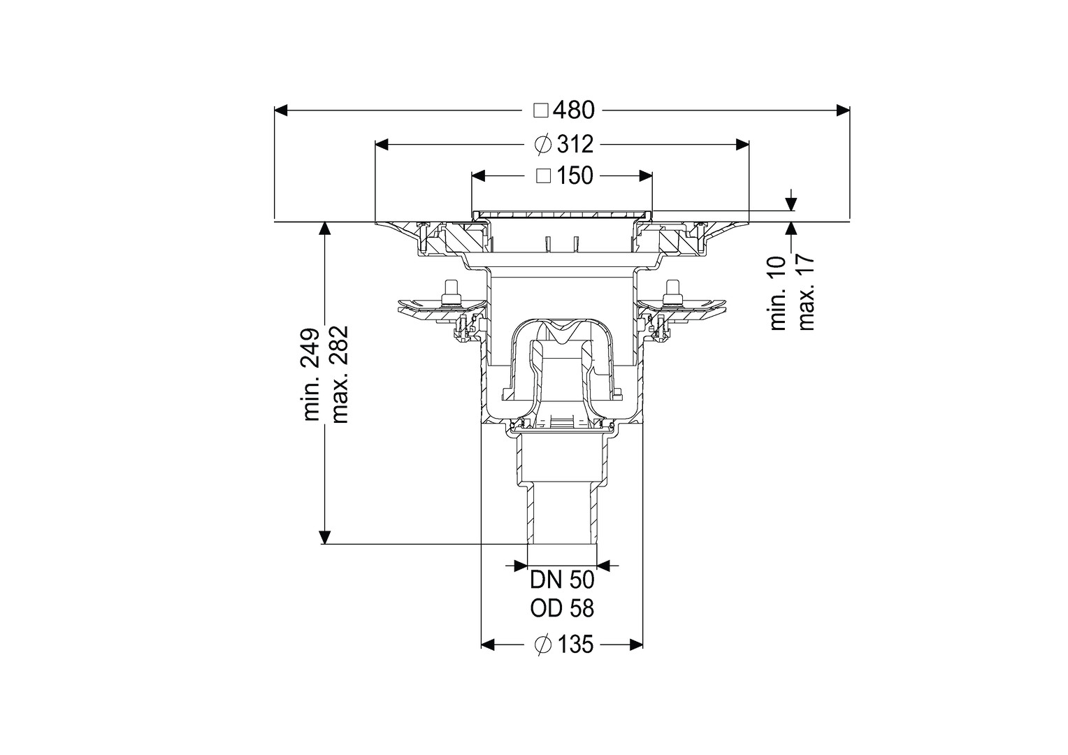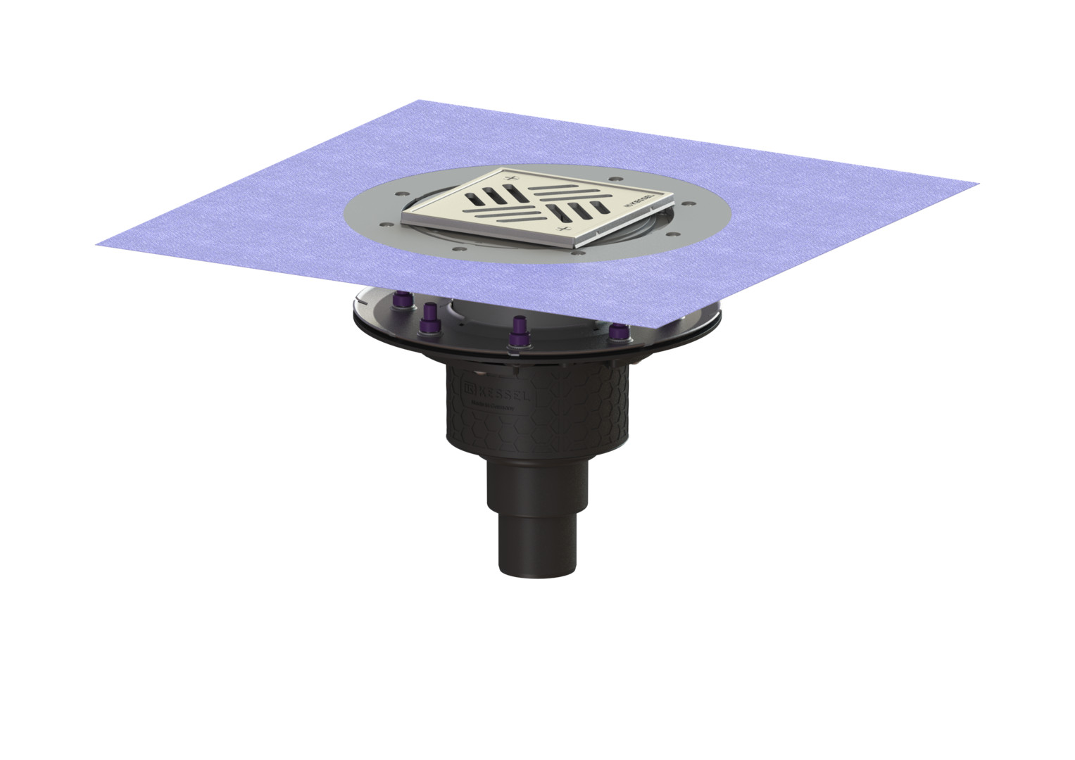 bestehend aus Grundkörper mit Auslauf senkrecht, aus Ecoguss resistant, mit Pressdichtungsflansch, Geruchsverschluss, Auslaufstutzen für SML-Rohranschluss, Sperrwasserhöhe 50 mm, Kernlochbohr-Maß 160 mm, Aufsatzstück für Abdichtung im Verbund aus ABS, mit beiliegender Dichtmanschette, Schlitzrost 138 x 138 mm, Rahmen aus Edelstahl V2A, Klasse K 3, verschraubt