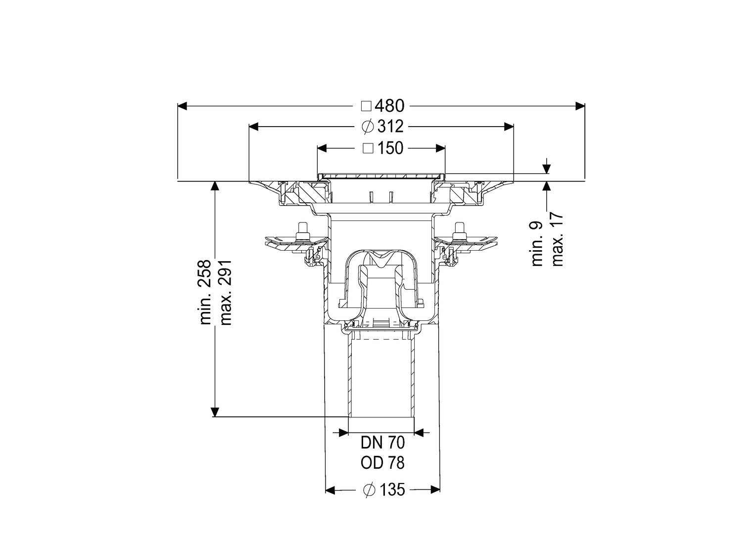 bestehend aus Grundkörper mit Auslauf senkrecht, aus Ecoguss resistant, mit Pressdichtungsflansch, Geruchsverschluss, Auslaufstutzen für SML-Rohranschluss, Sperrwasserhöhe 50 mm, Kernlochbohr-Maß 160 mm, Aufsatzstück für Abdichtung im Verbund aus ABS, mit beiliegender Dichtmanschette, Schlitzrost 138 x 138 mm, Rahmen aus Edelstahl V2A, Klasse K 3, verschraubt