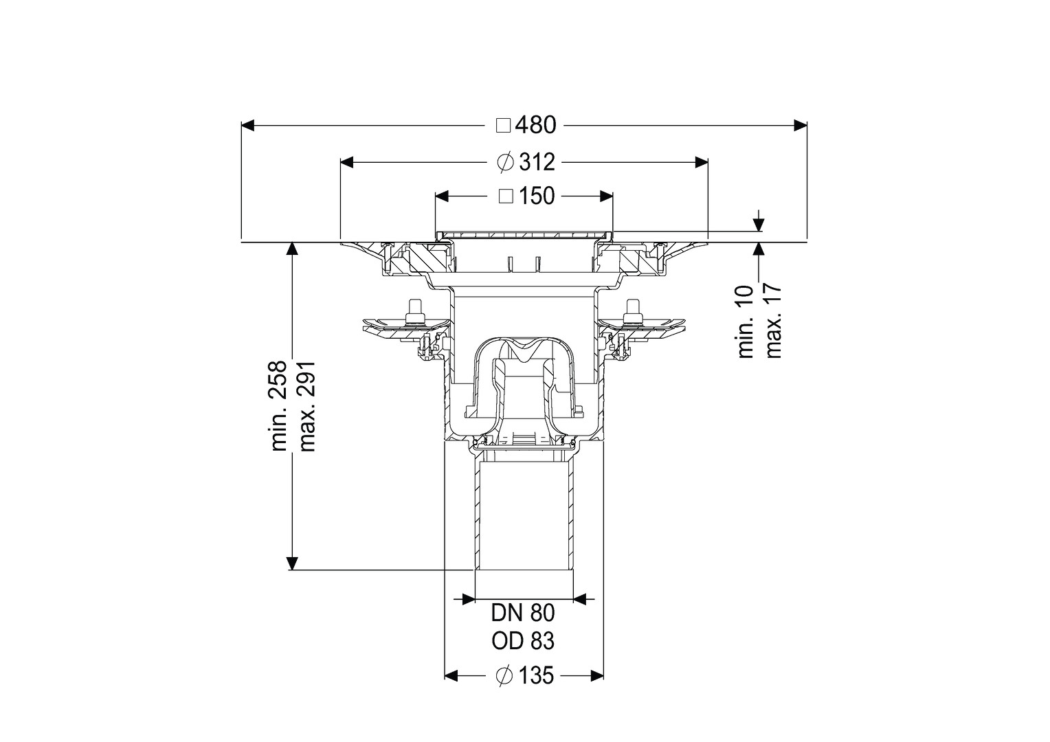 bestehend aus Grundkörper mit Auslauf senkrecht, aus Ecoguss resistant, mit Pressdichtungsflansch, Geruchsverschluss, Auslaufstutzen für SML-Rohranschluss, Sperrwasserhöhe 50 mm, Kernlochbohr-Maß 160 mm, Aufsatzstück für Abdichtung im Verbund aus ABS, mit beiliegender Dichtmanschette, Schlitzrost 138 x 138 mm, Rahmen aus Edelstahl V2A, Klasse K 3, verschraubt
