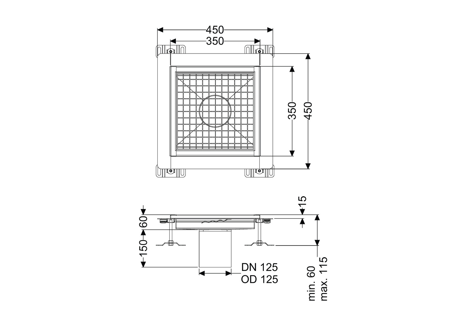zum Einbau in die Bodenplatte, Materialstärke 2 mm, im Tauchbad gebeizt, Sichtstege geschliffen, Längs- und Quergefälle, Standfüße zur Höhennivellierung, Auslaufstutzen aus Edelstahl, Rinnenprofil für Abdichtungen im Verbund, mit Kleberand 15 mm tief und 50 mm nach außen abgekantet, umlaufend, mit verschweißten Gehrungen, Abdeckung: Gitterrost aus Edelstahl, rutschhemmend R12, im Tauchbad gebeizt, Maschenweite 23 × 23 mm, Belastungsklasse L 15 (1,5 t), optional als Zubehör passende Ablaufgrundkörper System 125, Variofix Ablaufstutzen aus Edelstahl, bis 5 mm radial verschiebbar