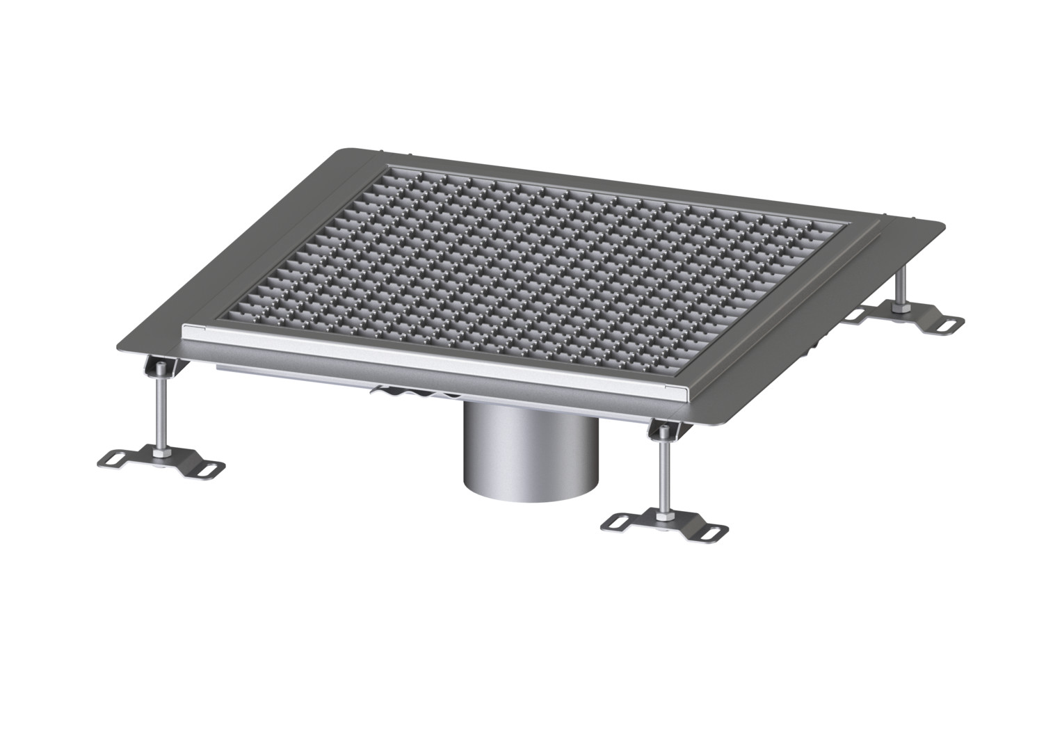 zum Einbau in die Bodenplatte, Materialstärke 2 mm, im Tauchbad gebeizt, Sichtstege geschliffen, Längs- und Quergefälle, Standfüße zur Höhennivellierung, Auslaufstutzen aus Edelstahl, Rinnenprofil für Abdichtungen im Verbund, mit Kleberand 15 mm tief und 50 mm nach außen abgekantet, umlaufend, mit verschweißten Gehrungen, Abdeckung: Gitterrost aus Edelstahl, rutschhemmend R12, im Tauchbad gebeizt, Maschenweite 23 × 23 mm, Belastungsklasse L 15 (1,5 t), optional als Zubehör passende Ablaufgrundkörper System 125, Variofix Ablaufstutzen aus Edelstahl, bis 5 mm radial verschiebbar
