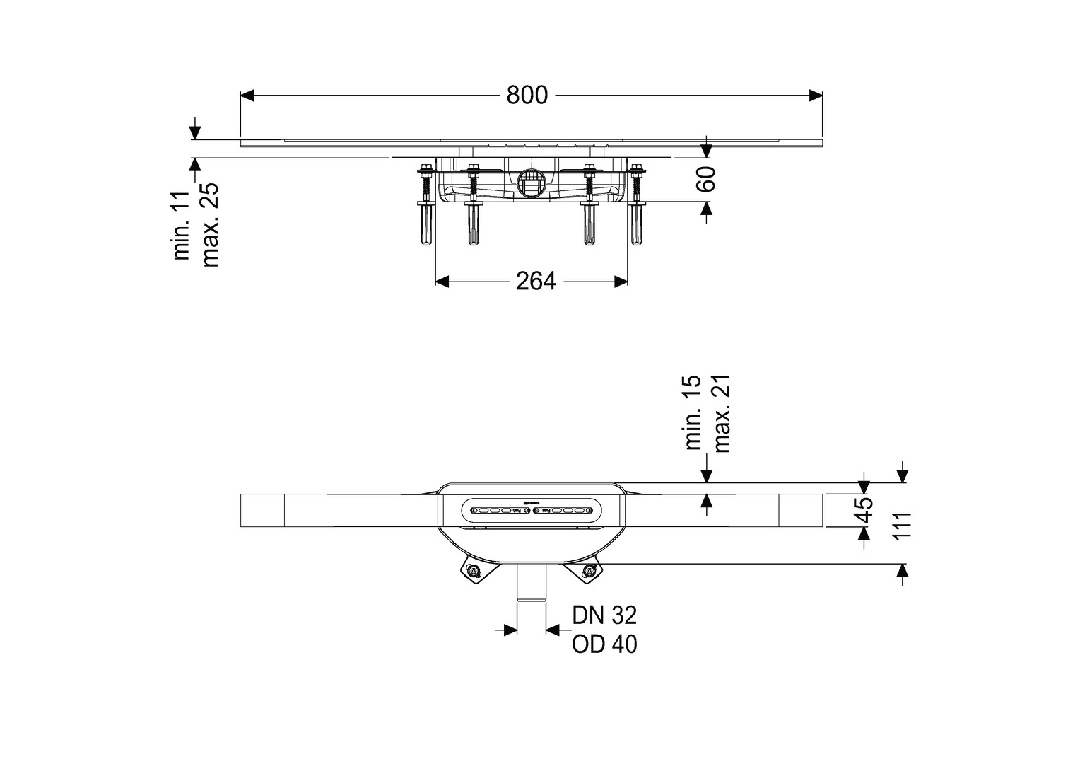 mit Rinnenprofil aus Edelstahl V4A, Grundkörper aus PP, min. Bauhöhe 60 mm, Auslauf seitlich DN 40, mechanischer Geruchsverschluss Megastop, Haarsieb, für Belaghöhe von 11-25 mm, werkseitig angebrachte Dichtmanschette nach DIN EN 1253-8 und DIN 18534-1-W3-I, Abdeckung Rinnenprofil aus Edelstahl V4A, Klasse K 3, Abflussleistung 0,4 l/s/0,2 l/s bei Anstau 20/10 mm, mit Schall- und Setzungsdämpfer