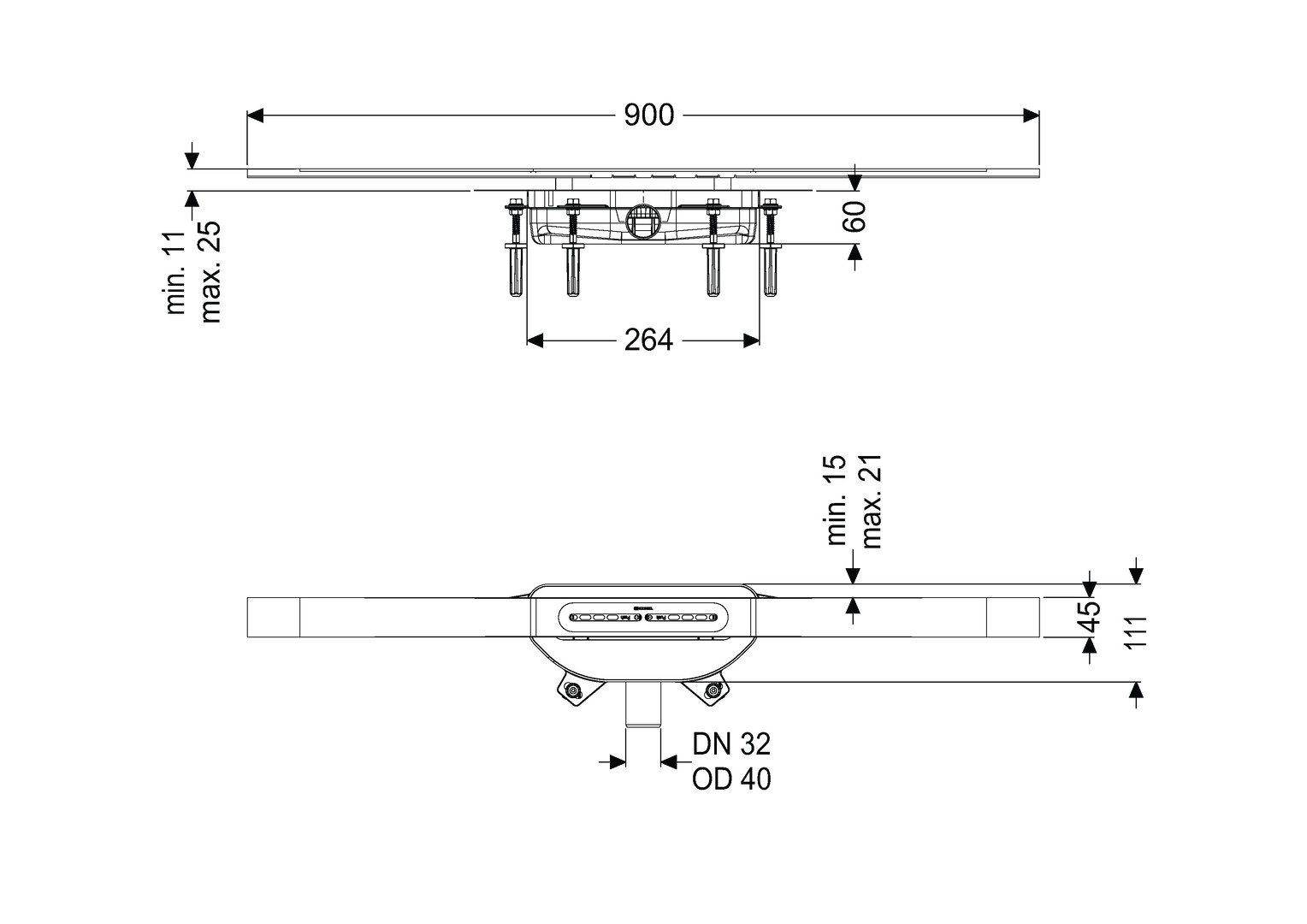 mit Rinnenprofil aus Edelstahl V4A, Grundkörper aus PP, min. Bauhöhe 60 mm, Auslauf seitlich DN 40, mechanischer Geruchsverschluss Megastop, Haarsieb, für Belaghöhe von 11-25 mm, werkseitig angebrachte Dichtmanschette nach DIN EN 1253-8 und DIN 18534-1-W3-I, Abdeckung Rinnenprofil aus Edelstahl V4A, Klasse K 3, Abflussleistung 0,4 l/s/0,2 l/s bei Anstau 20/10 mm, mit Schall- und Setzungsdämpfer