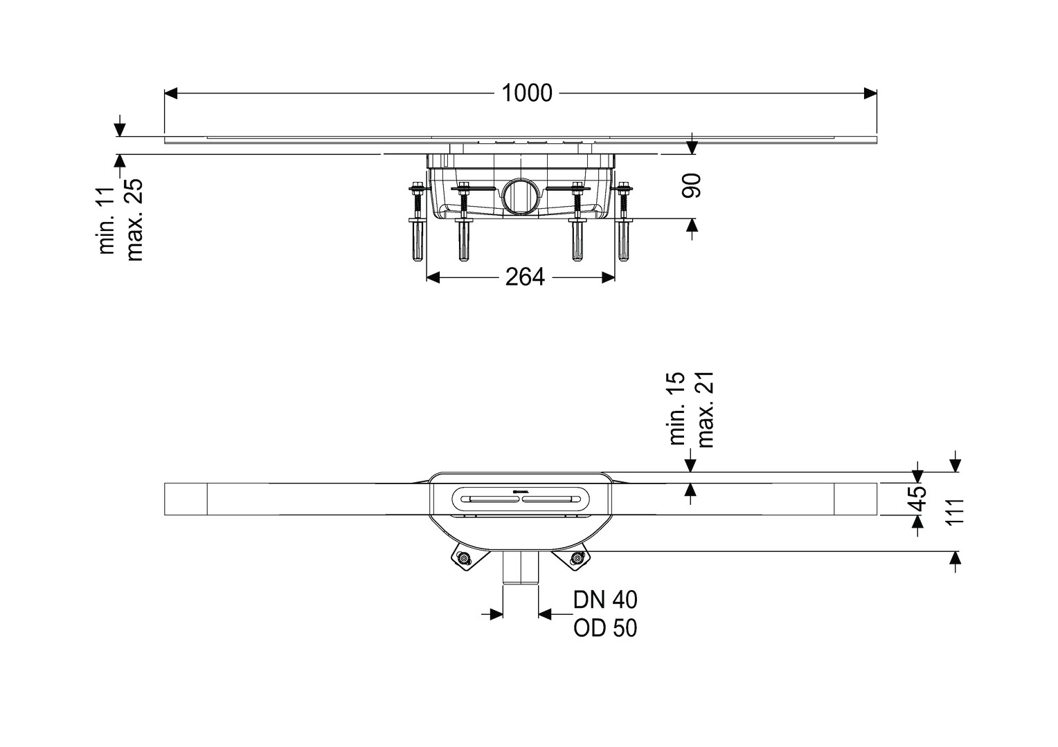 Geruchsverschluss mit 50 mm Wasservorlage, mit Rinnenprofil aus Edelstahl V4A, Grundkörper aus PP, min. Bauhöhe 90 mm, Auslauf seitlich DN 50, für Belaghöhe von 11-25 mm, werkseitig angebrachte Dichtmanschette nach DIN EN 1253-1 und DIN 18534-1-W3-I, Abdeckung Rinnenprofil aus Edelstahl V4A, Klasse K 3, Sperrwasserhöhe 50 mm, Abflussleistung 0,8 l/s/0,6 l/s bei Anstau 20/10 mm, mit Schall- und Setzungsdämpfer