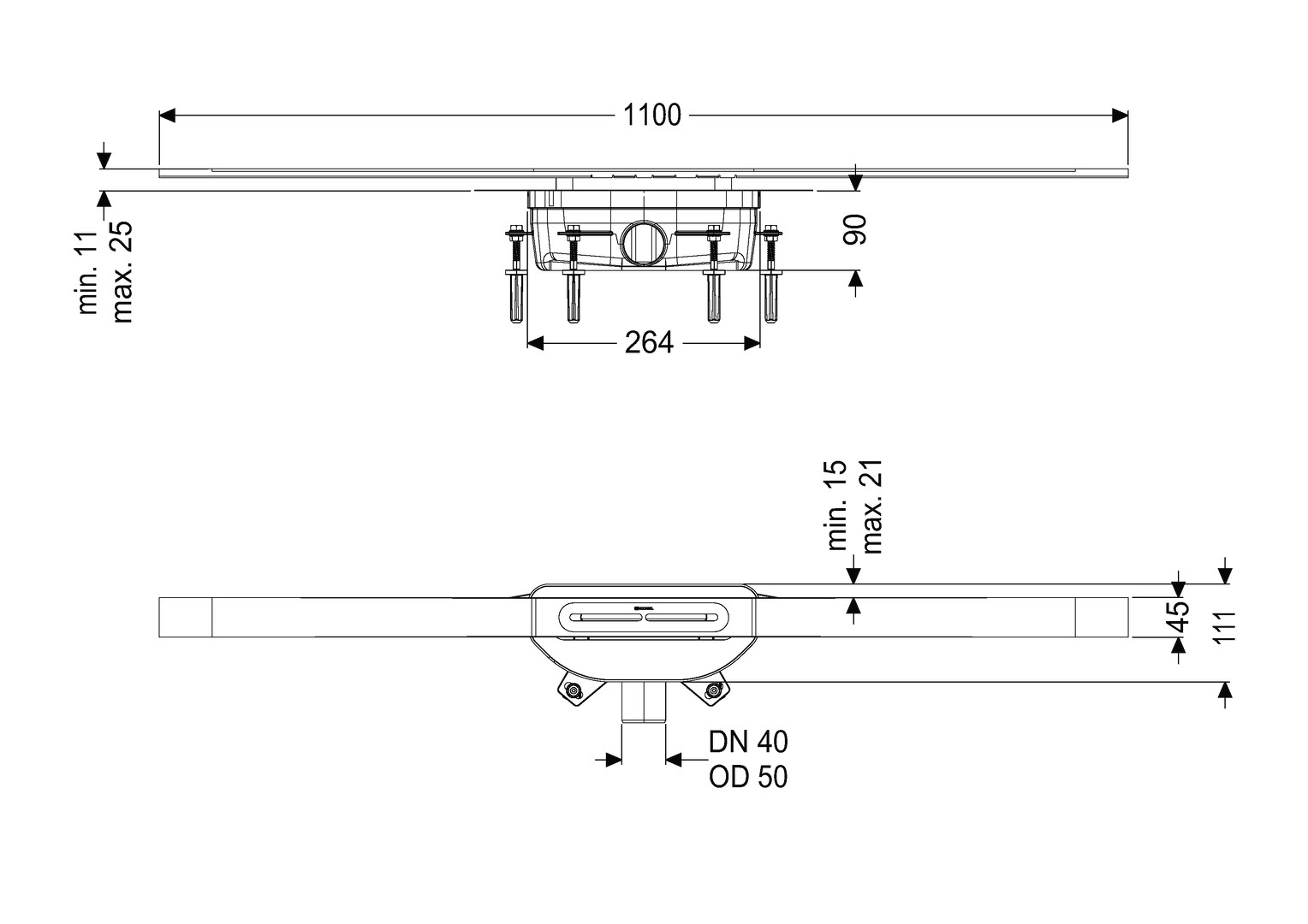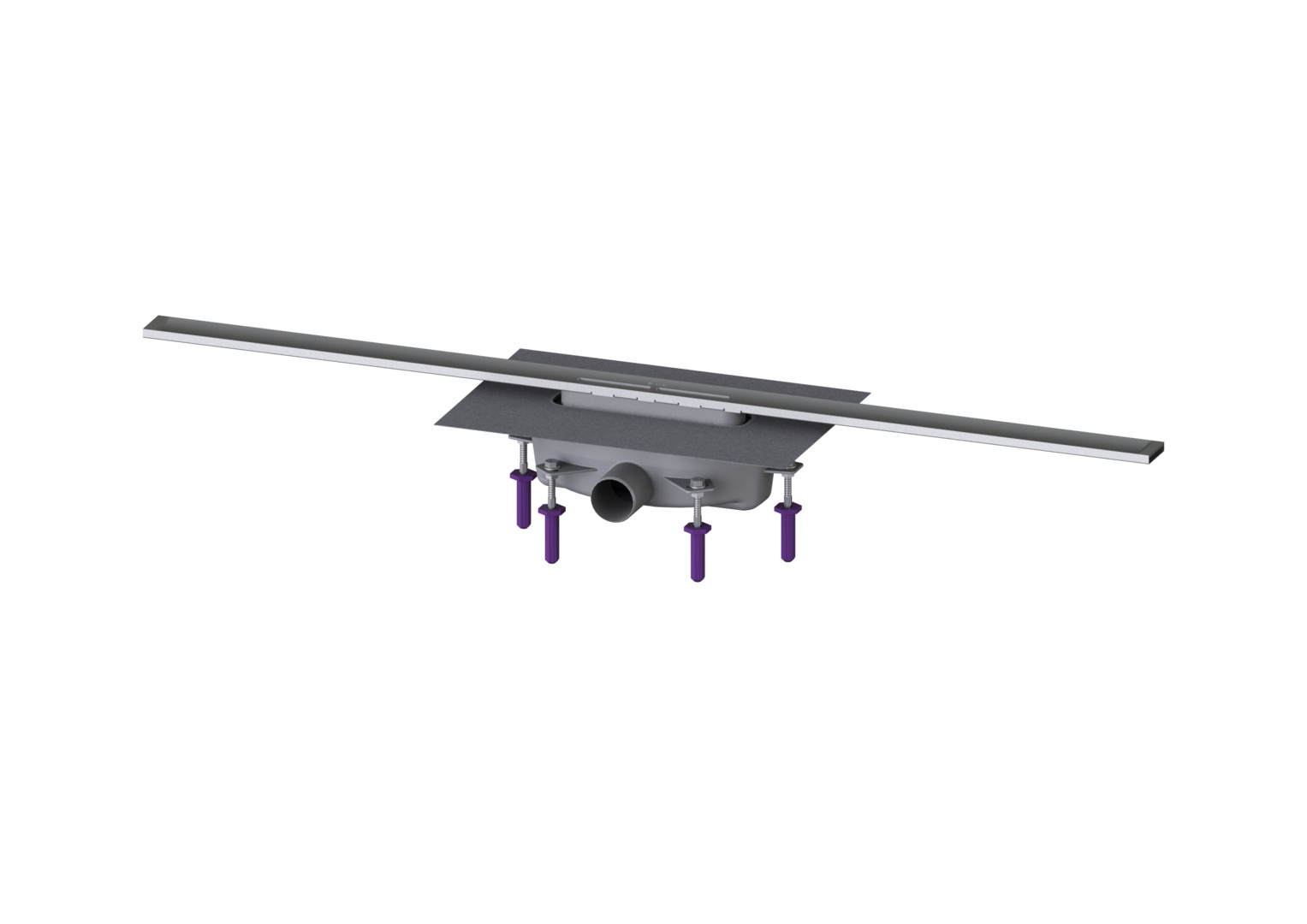 Geruchsverschluss mit 50 mm Wasservorlage, mit Rinnenprofil aus Edelstahl V4A, Grundkörper aus PP, min. Bauhöhe 90 mm, Auslauf seitlich DN 50, für Belaghöhe von 11-25 mm, werkseitig angebrachte Dichtmanschette nach DIN EN 1253-1 und DIN 18534-1-W3-I, Abdeckung Rinnenprofil aus Edelstahl V4A, Klasse K 3, Sperrwasserhöhe 50 mm, Abflussleistung 0,8 l/s/0,6 l/s bei Anstau 20/10 mm, mit Schall- und Setzungsdämpfer
