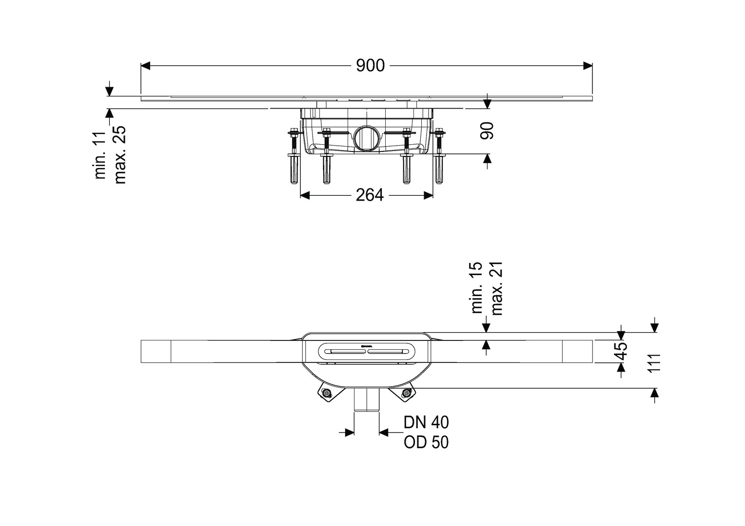 Geruchsverschluss mit 50 mm Wasservorlage, mit Rinnenprofil aus Edelstahl V4A, Grundkörper aus PP, min. Bauhöhe 90 mm, Auslauf seitlich DN 50, für Belaghöhe von 11-25 mm, werkseitig angebrachte Dichtmanschette nach DIN EN 1253-1 und DIN 18534-1-W3-I, Abdeckung Rinnenprofil aus Edelstahl V4A, Klasse K 3, Sperrwasserhöhe 50 mm, Abflussleistung 0,8 l/s/0,6 l/s bei Anstau 20/10 mm, mit Schall- und Setzungsdämpfer