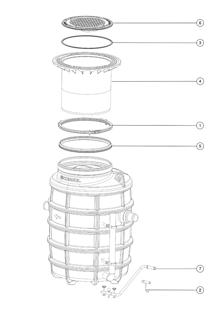 aus Kunststoff, Einbau für frostfreie Tiefe 1200 mm, Einbautiefe 765-1225 mm, grundwasserbeständig bis 500 mm über Behältersohle, teleskopisch höhenverstellbares Aufsatzstück aus Kunststoff, Abdeckung nach DIN EN 124 aus Guss (PKW-/LKW befahrbar), geruchsdicht verschlossen, Aushebeschlüssel, Durchführungsset (NS 4), Anlage komplett montiert, Zubehör Probenahmeeinrichtung, Verlängerungsstück, Hebeanlage, Schichtdicken-Messgerät für Fette, SonicControl