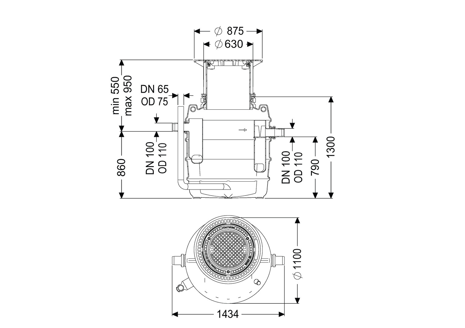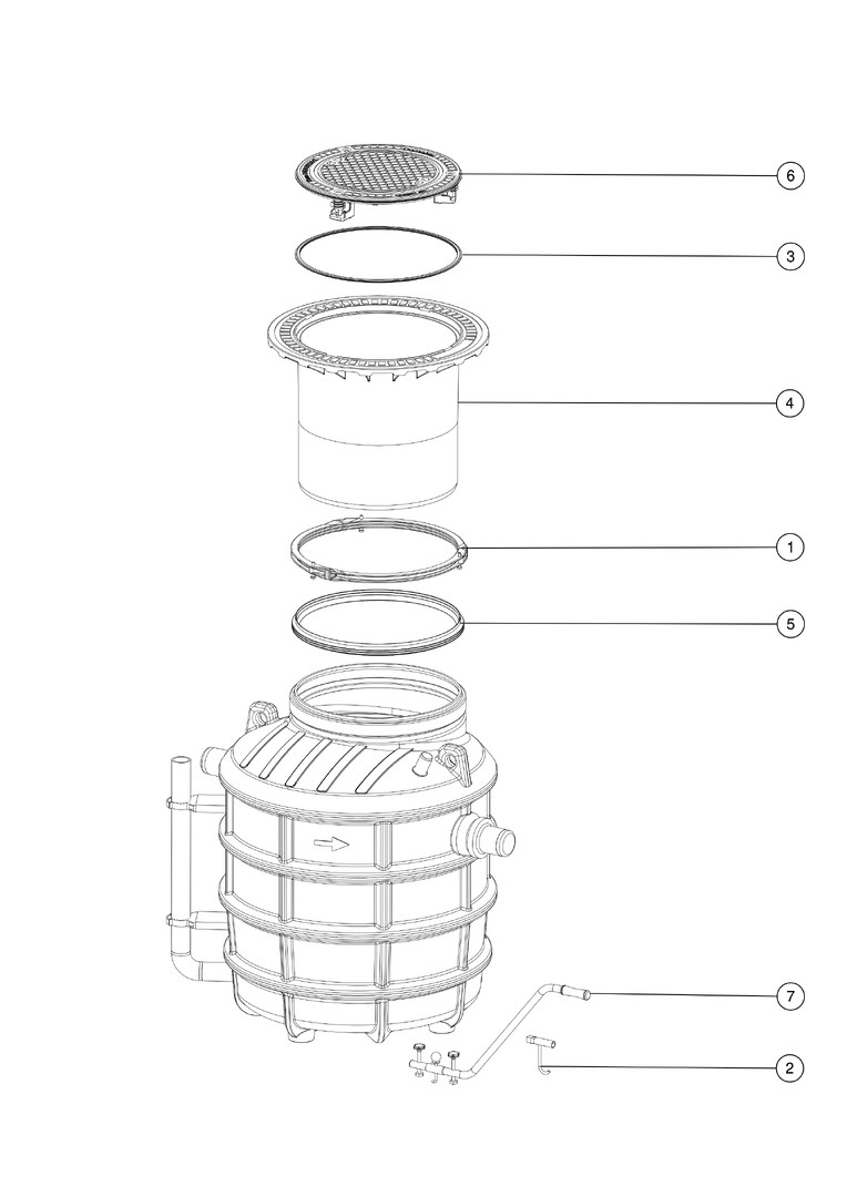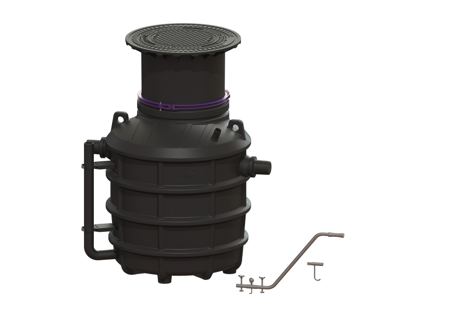 aus Kunststoff, Einbau für frostfreie Tiefe 800 mm, Einbautiefe 805-975 mm, grundwasserbeständig bis 500 mm über Behältersohle, bei Belastungsklasse D ist eine Lastverteilplatte vorzusehen, teleskopisch höhenverstellbares Aufsatzstück aus Kunststoff, Abdeckung nach DIN EN 124 aus Guss (PKW-/LKW befahrbar), geruchsdicht verschlossen, Aushebeschlüssel, Durchführungsset (NS 4), Anlage komplett montiert, Zubehör Probenahmeeinrichtung, Verlängerungsstück, Hebeanlage, Schichtdicken-Messgerät für Fette, SonicControl