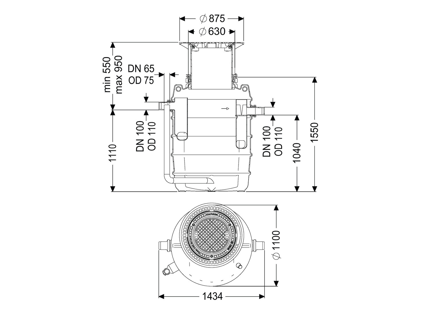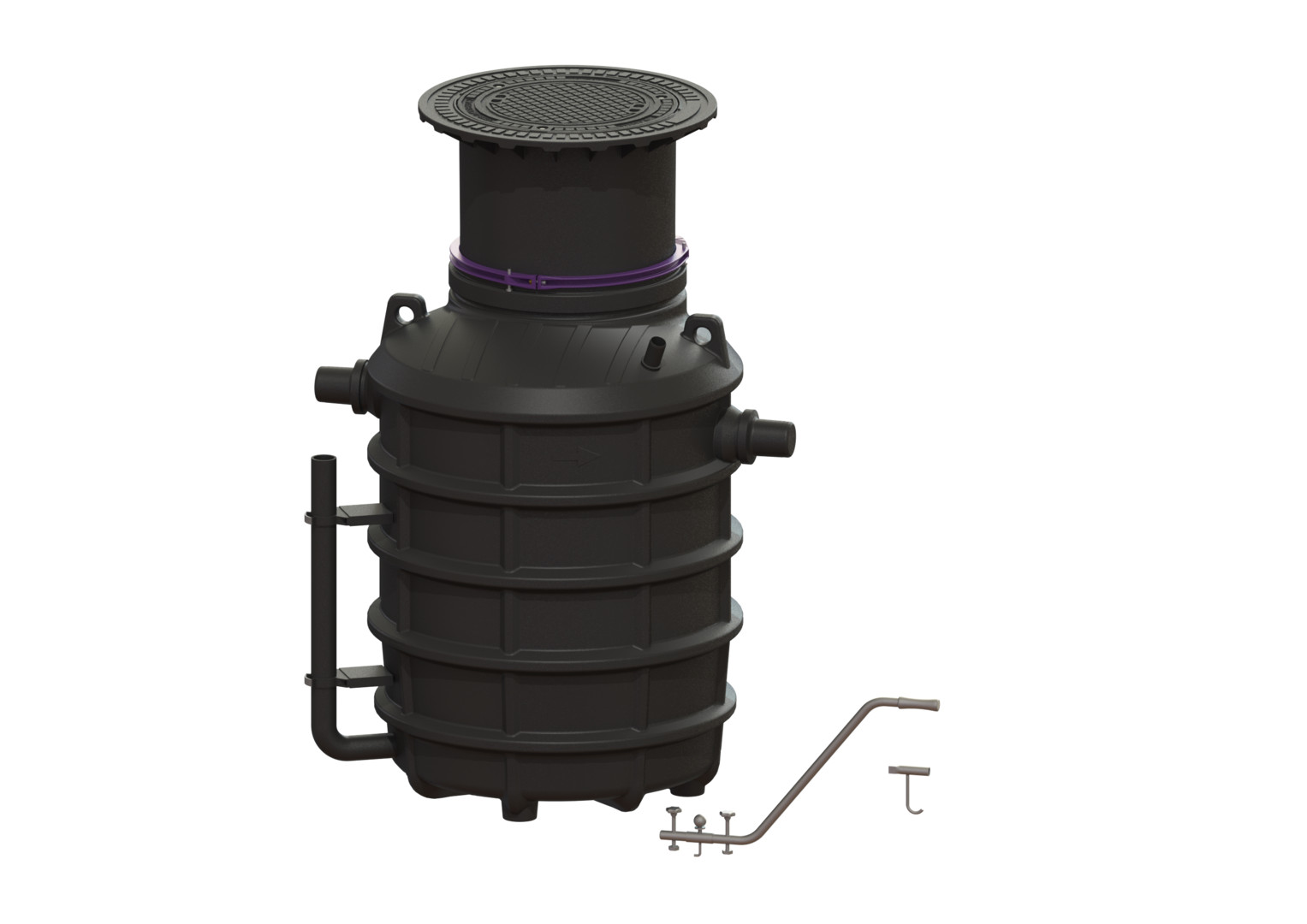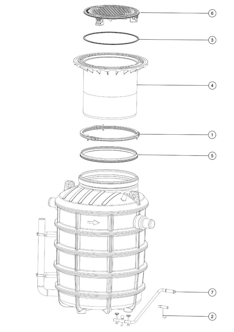 aus Kunststoff, Einbau für frostfreie Tiefe 800 mm, Einbautiefe 805-975 mm, grundwasserbeständig bis 500 mm über Behältersohle, bei Belastungsklasse D ist eine Lastverteilplatte vorzusehen, teleskopisch höhenverstellbares Aufsatzstück aus Kunststoff, Abdeckung nach DIN EN 124 aus Guss (PKW-/LKW befahrbar), geruchsdicht verschlossen, Aushebeschlüssel, Durchführungsset (NS 4), Anlage komplett montiert, Zubehör Probenahmeeinrichtung, Verlängerungsstück, Hebeanlage, Schichtdicken-Messgerät für Fette, SonicControl