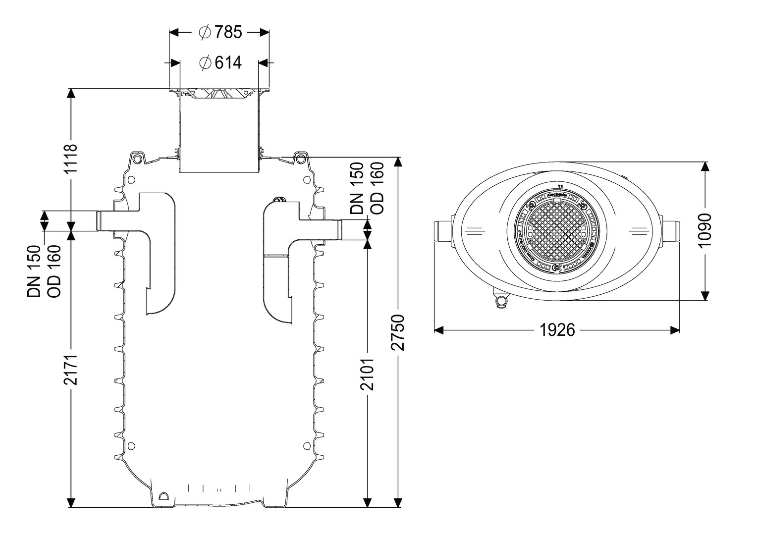 Kessel Fettabscheider EasyClean G Direkt NS 10, Einbautiefe 880-1170 mm, oval, Abdeckung Klasse D, Fließrichtung rechts