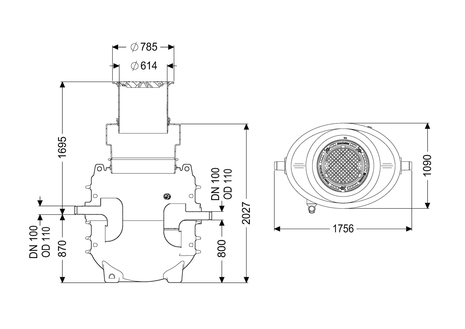 Kessel Fettabscheider EasyClean G Direkt NS 2, Einbautiefe 1190-1740 mm, oval, Abdeckung Klasse D, Fließrichtung rechts