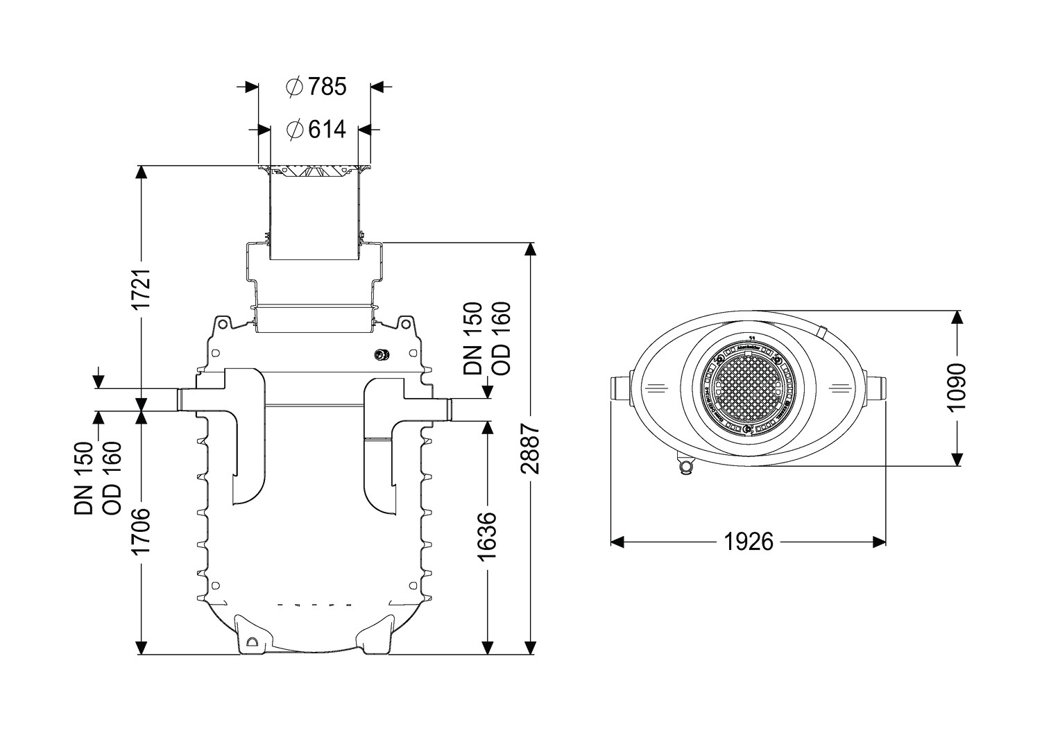 Kessel Fettabscheider EasyClean G Direkt NS 7, Einbautiefe 1215-1765 mm, oval, Abdeckung Klasse D, Fließrichtung rechts