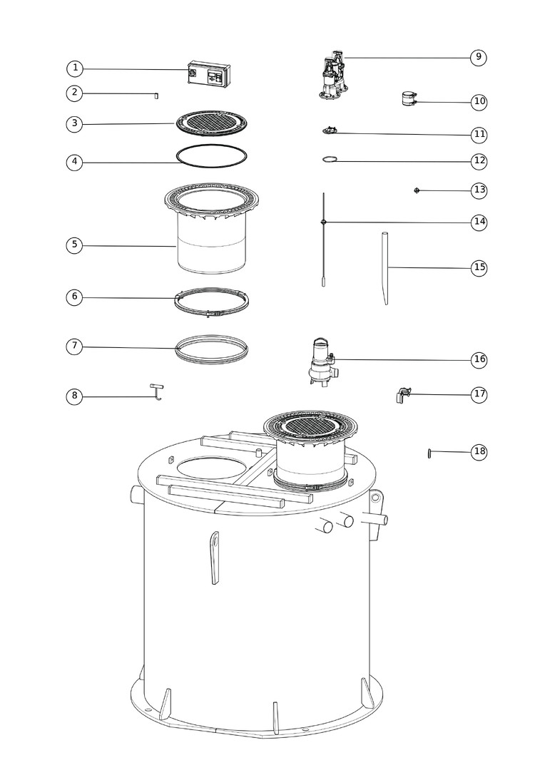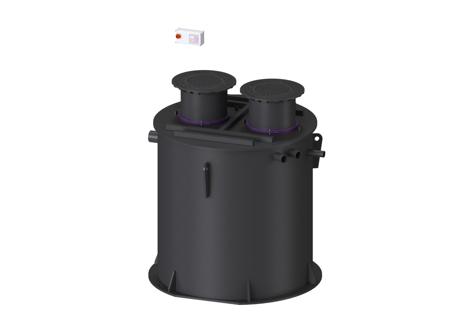 aus Kunststoff, Einbau für frostfreie Tiefe 800 mm, Einbau bis Grundwasser GOK, min. Einbautiefe erreichbar durch Ablängen des Aufsatzstückes, mit Fettabscheider im Wickelrohr, mit integrieter Probenahme, Pumpstation in Nassaufstellung mit Pumpen GTK 1300-S1 (NS 7 und 10), GTK 1400 (NS 4), teleskopisch höhenverstellbares Aufsatzstück aus Kunststoff, Abdeckung nach DIN En 124 aus Guss (PKW- bzw. LKW-befahrbar) geruchsdicht verschlossen, Auslieferung Abscheider komplett montiert, Pumpen separat, Zubehör Schichtdicken-Messgerät für Fette SonicControl