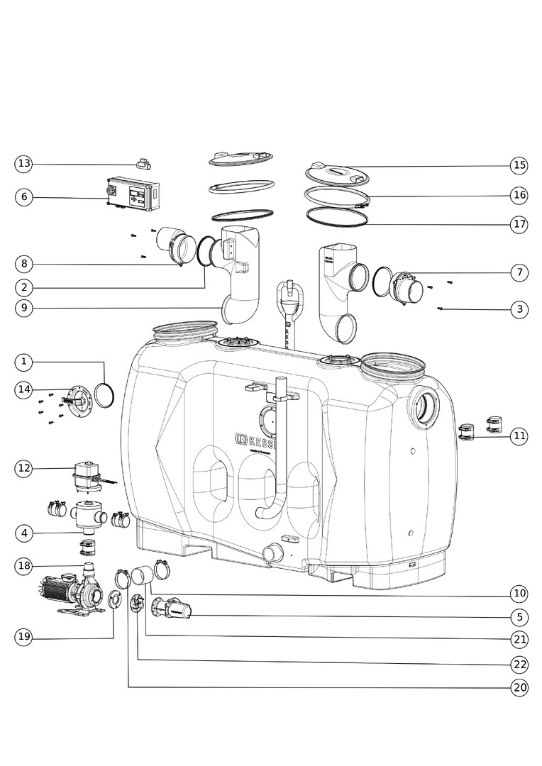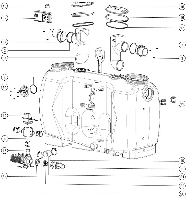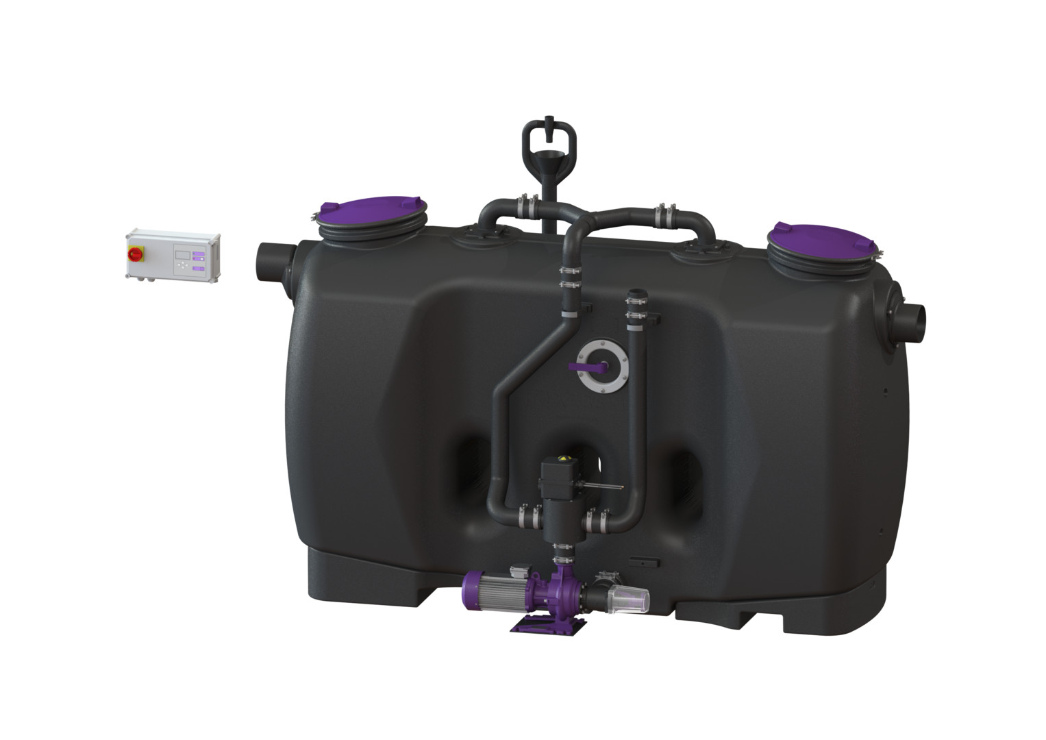 aus PE, Einbau in frostgeschützten Räumen, mit programmgesteuerter Entsorgungs- und Reinigungseinrichtung, Schredder-Mix-System, Schaltgerät, Schauglas, Fülleinrichtung, Pumpe und Trinkwasserspülung, die Fließrichtung kann durch Austauschen des Zu- und Ablaufstutzens geändert werden, Pumpenleistung 3 kW, Kabellänge für Anbauteile 5 m, Anlage komplett montiert, Zubehör Probeentnahmeeinrichtung, Hebeanlagen, Fernbedienung