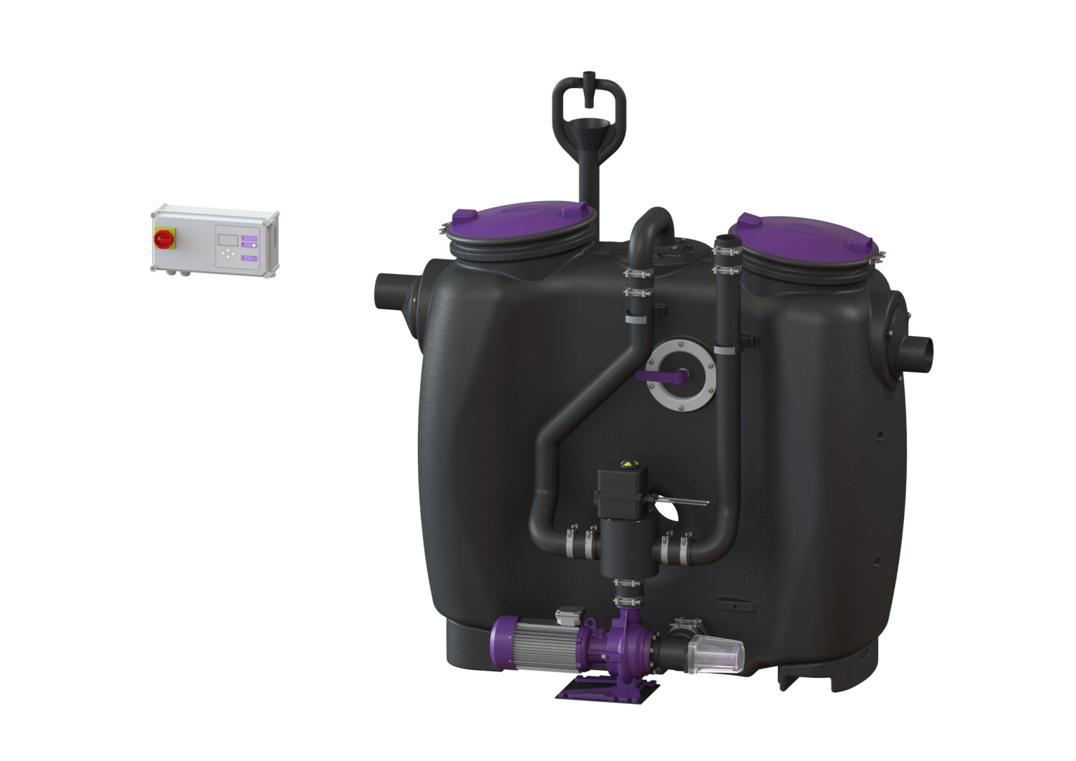 aus PE, Einbau in frostgeschützten Räumen, mit programmgesteuerter Entsorgungs- und Reinigungseinrichtung, Schredder-Mix-System, Schaltgerät, Schauglas, Fülleinrichtung, Pumpe und Trinkwasserspülung, die Fließrichtung kann durch Austauschen des Zu- und Ablaufstutzens geändert werden, Pumpenleistung 3 kW, Kabellänge für Anbauteile 5 m, Anlage komplett montiert, Zubehör Probeentnahmeeinrichtung, Hebeanlagen, Fernbedienung
