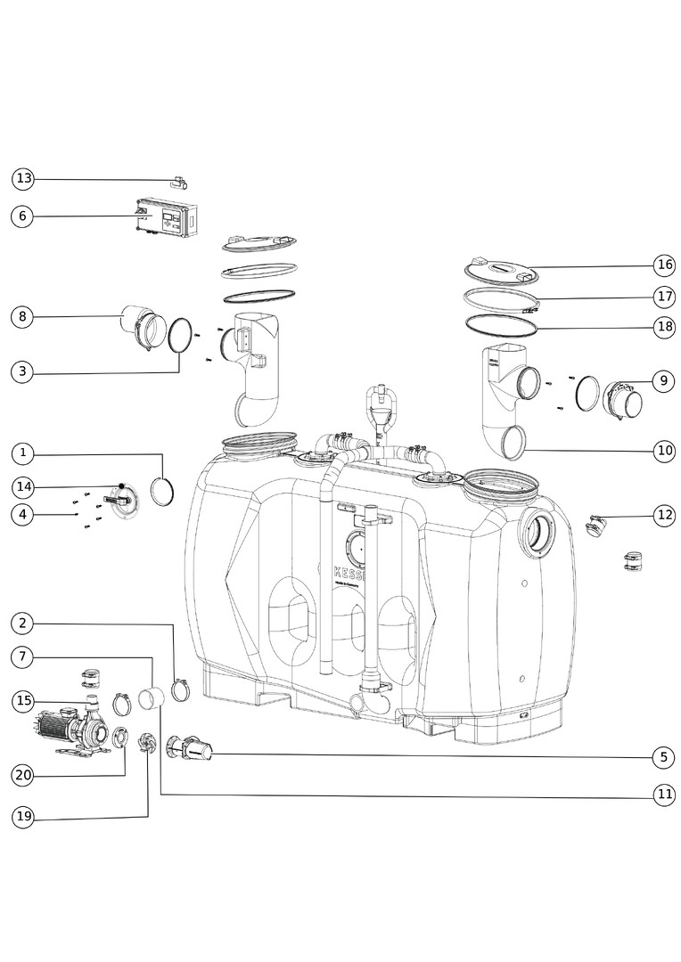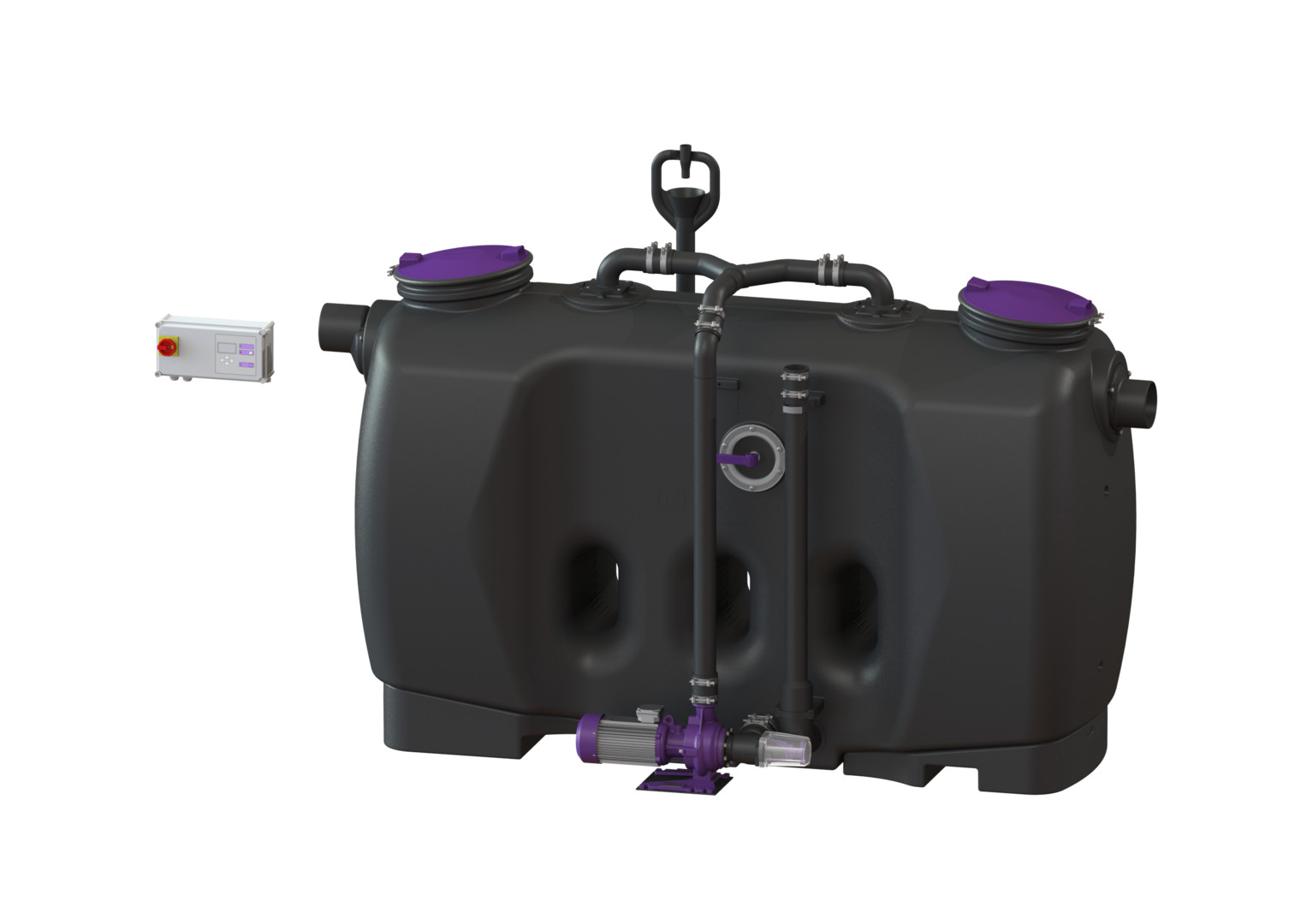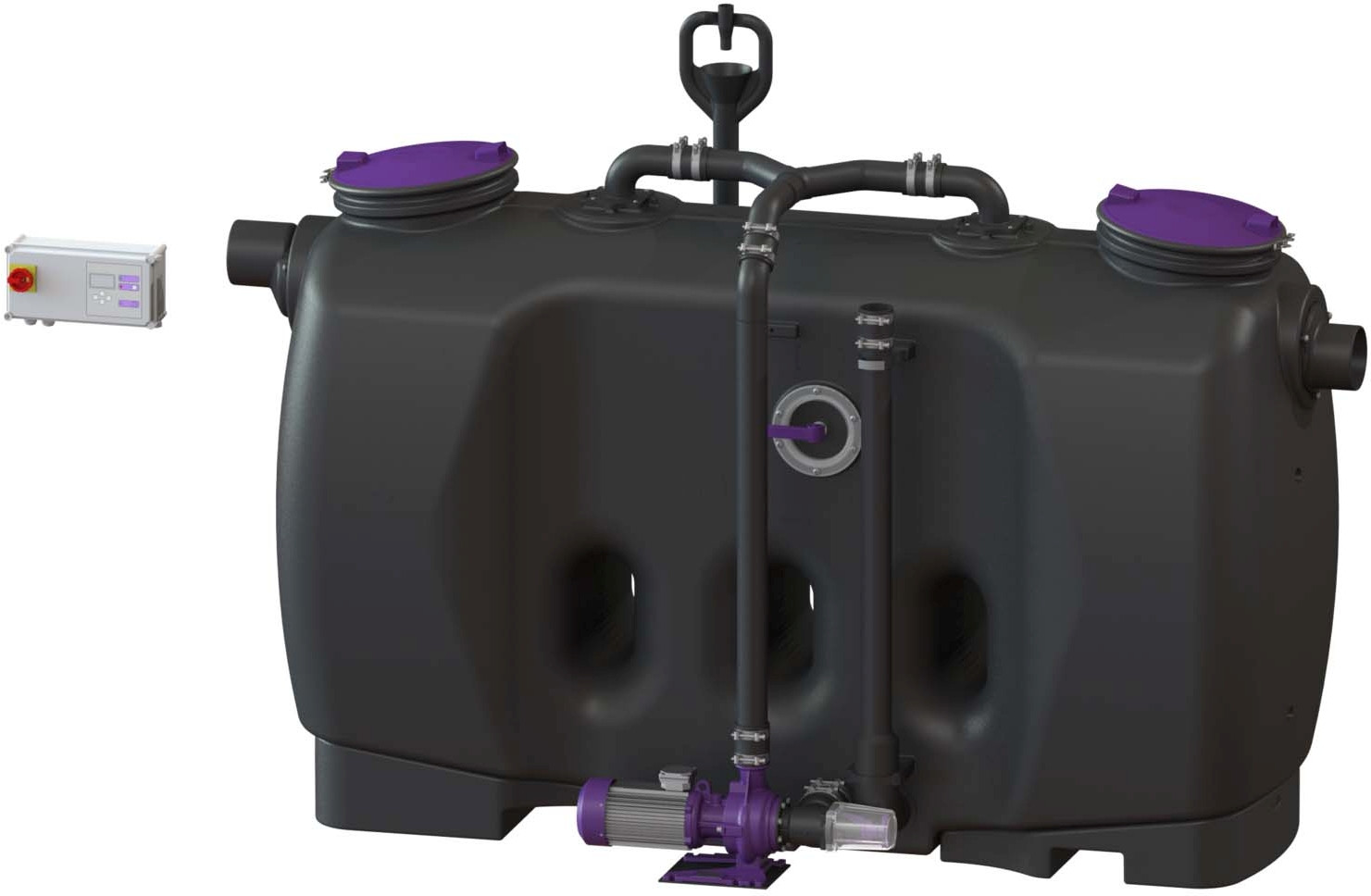 aus PE, Einbau in frostgeschützten Räumen, mit Direktentsorgung, programmgesteuertem Schredder-Mix-System, Schaltgerät, Schauglas, Fülleinrichtung und Pumpe, die Fließrichtung kann durch Austauschen des Zu- und Ablaufstutzens geändert werden, Pumpenleistung 3 kW, Kabellänge für Anbauteile 5 m, Anlage komplett montiert, Zubehör Probenahmeeinrichtung, Hebeanlagen, Fernbedienung
